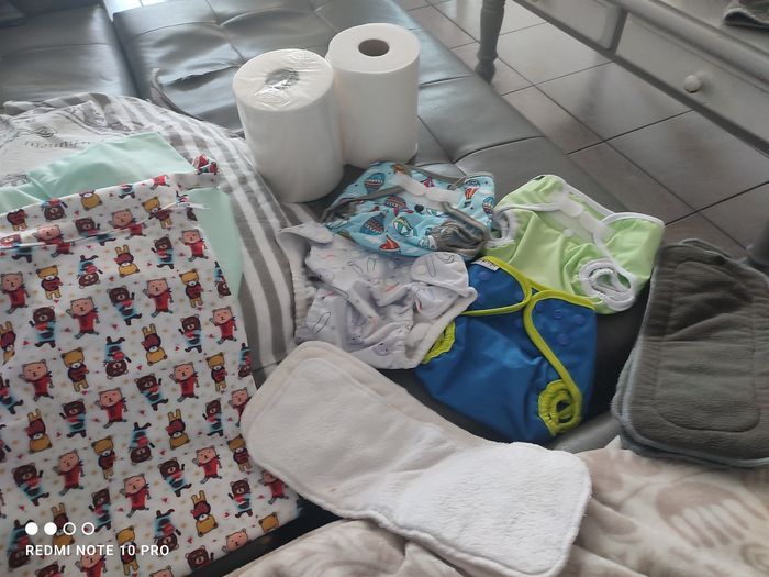 Couche jamais utilisé vendu après séparation. 41 inserts et 20 couches lavable . 2 gros sacs pour mettre couche salle qui isole les odeurs. Taille réglable jusqu'à propreté. 2 rouleaux de feuilles qui récupèrent les selles de 120 chacun .