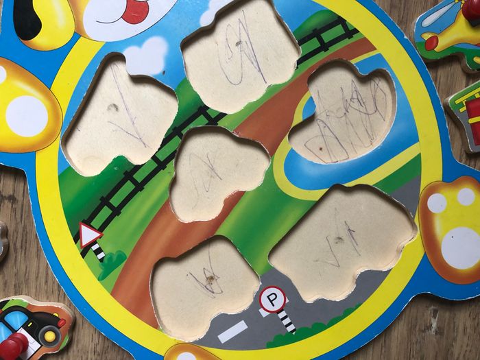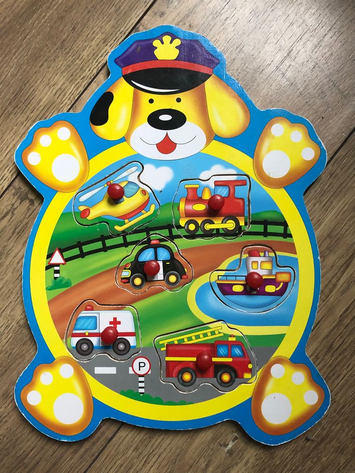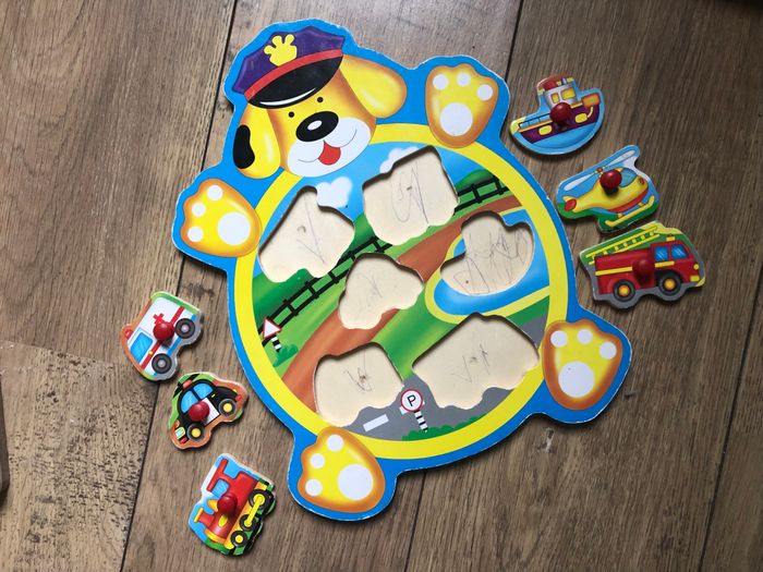 Puzzle en bois véhicules souvent utilisé Defaut a noter: Traces de crayon (voir photo)
