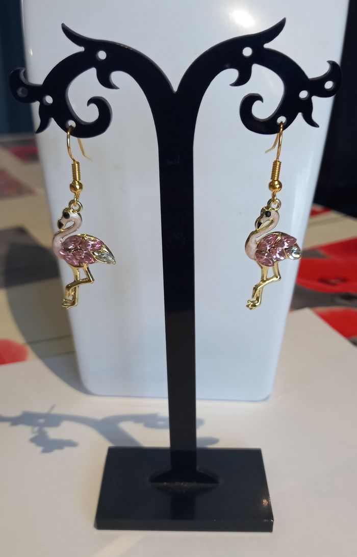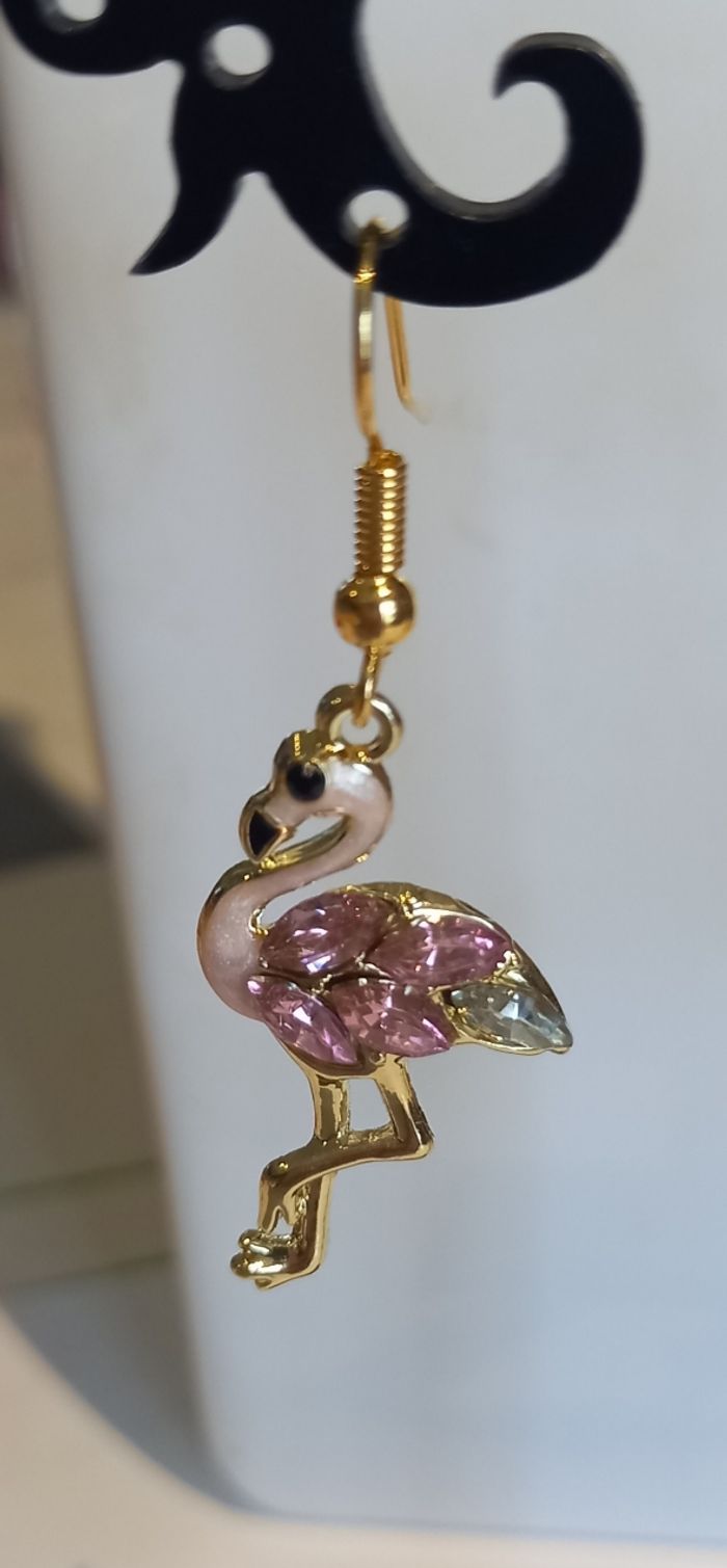 1 jolie paire de boucles d'oreilles motif flamand rose. Coloris doré, sertit de strass roses. Hauteur : 4,5 cms. Boucles neuves sous blister. N'hésitez pas à regarder mes autres ventes. Envoi rapide et soigné.