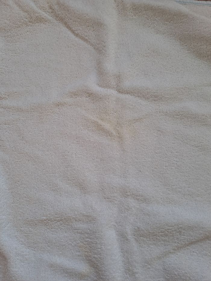 Serviettes de bain avec capuche. Motif étoiles bleues pour la petite format carré de 70cm. Petite tâche de liniment discrètesur l'envers (que vous pourrez détacher facilement, avec percarbonate par exemple) Motif fleurs roses et grises pour la grande format carré de 75cm