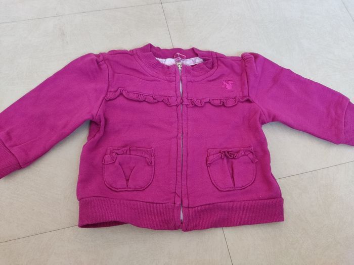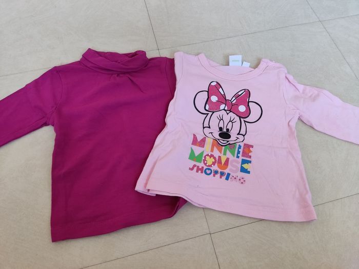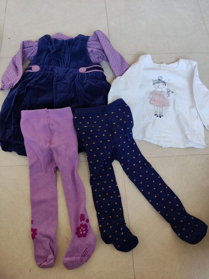Lot d'hiver en 6 mois : Ensemble robe boule velours, 2 tee shirts ML et 2 collants Verbaudet Sous pull framboise, tee shirt rose clair ML Minnie Veste framboise zippée Chicco Pantalon coton violet type jogging Chicco Pyjama velours TAO Combi pilote Obaidi