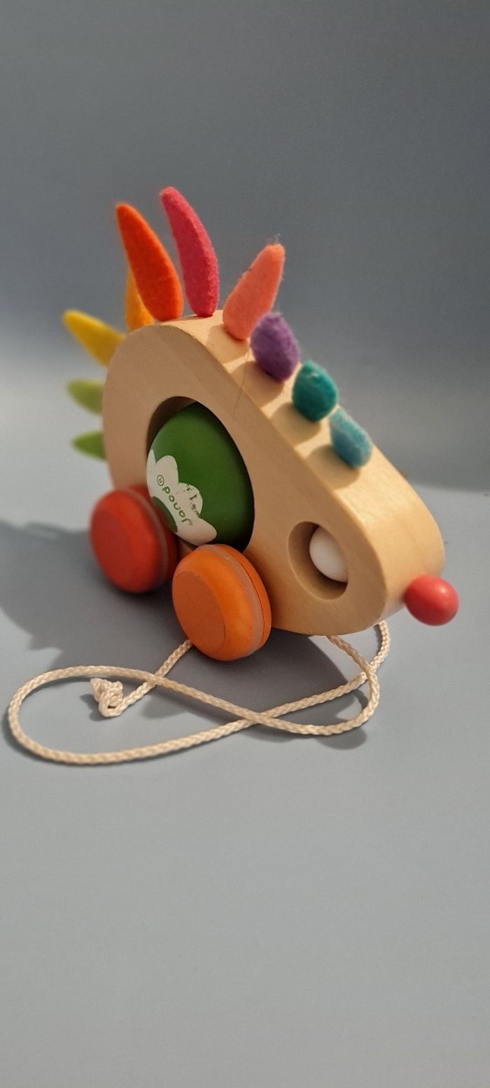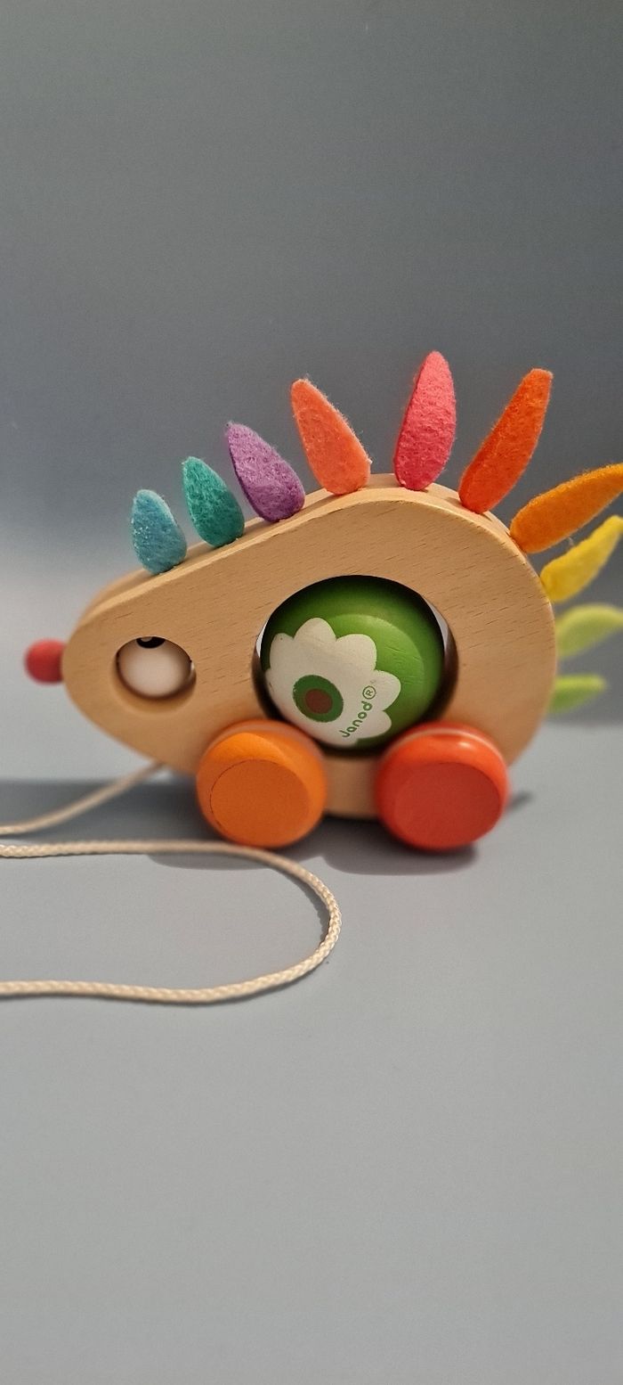 Joli petit hérisson en bois à tirer. Le ventre du hérisson tourne mais il n'est pas détachable. Stimule la coordination œil-main et l'équilibre de votre enfant.