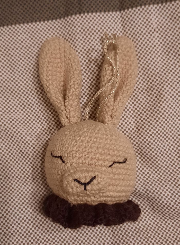 Boule lièvre coton-acrylique marron clair. Collerette marron foncée. Environ 14cm avec les oreilles.