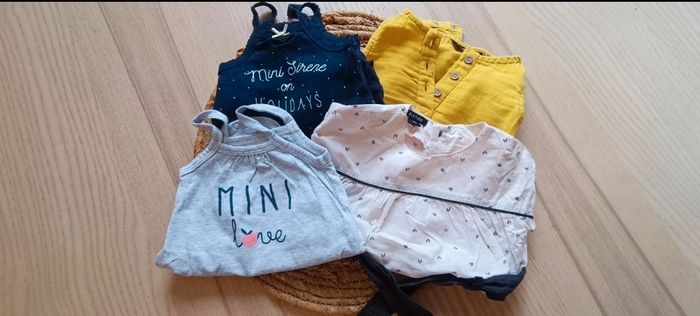 Lot de 4 bodies en bon état taille 3 mois. Ni taches ni trou, taille correctement