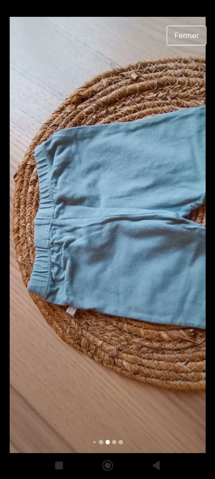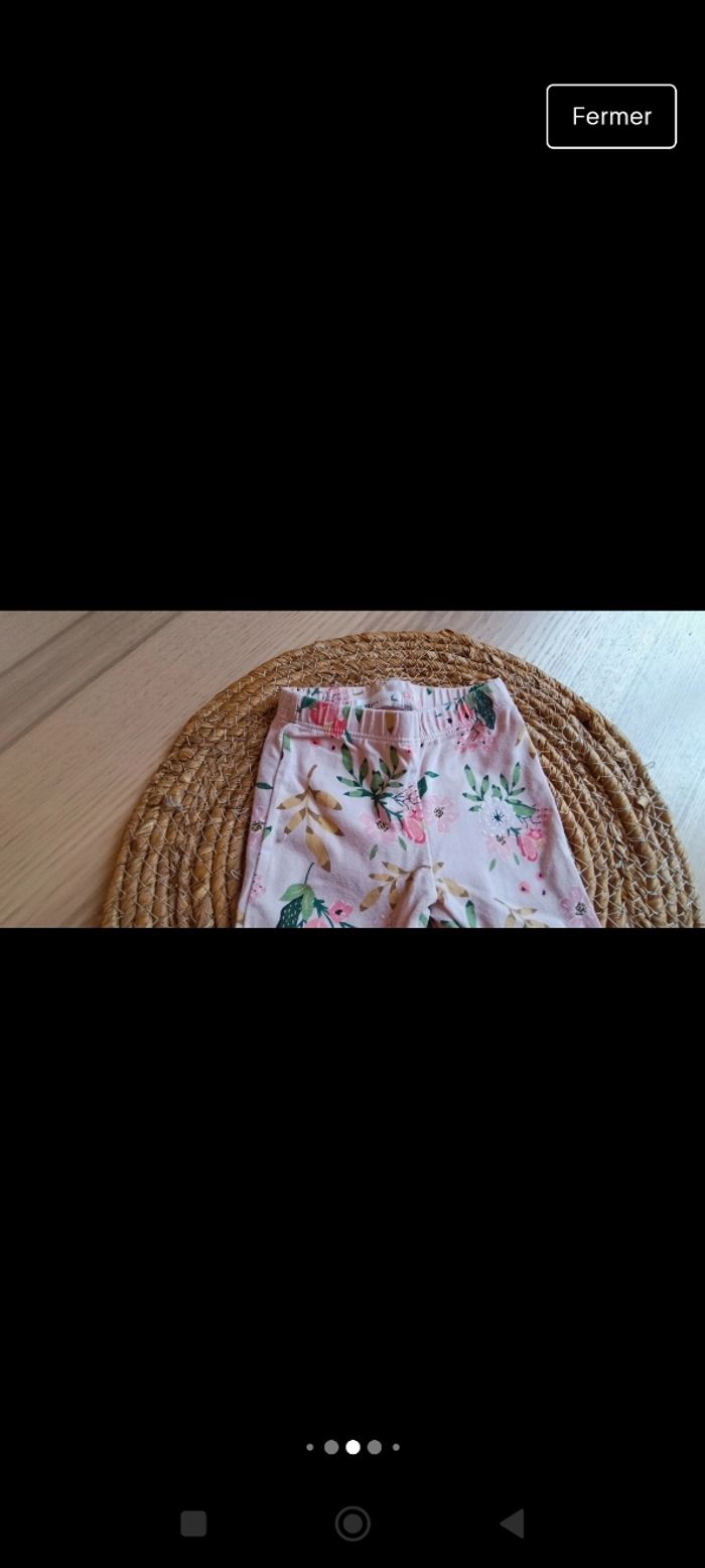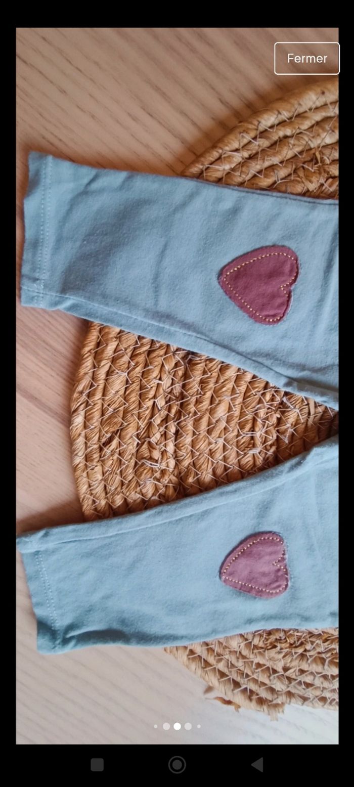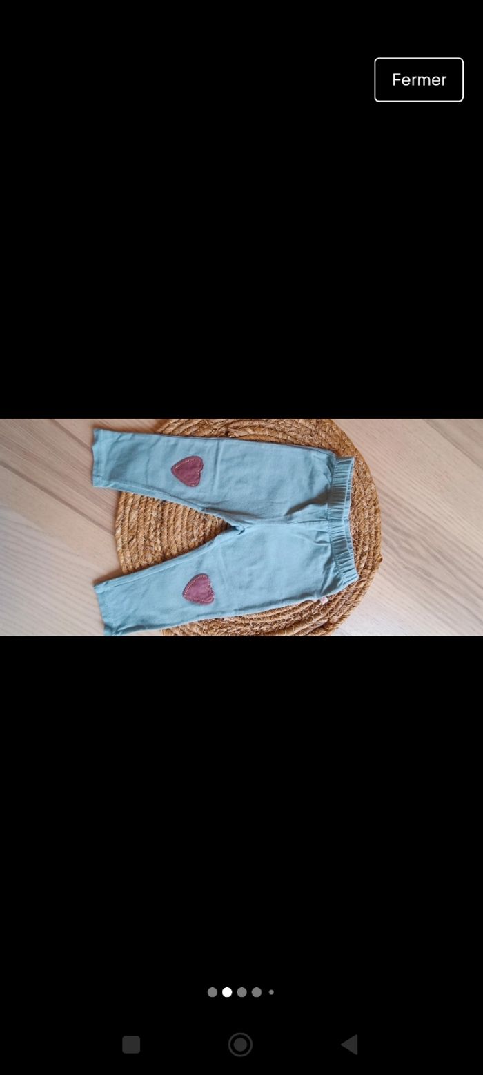 Leggings a fleur en bon état porté plusieurs fois, couleur un peu moins criarde et un legging vert d'eau porté quelques fois en bon état également. Les Leggings taille correctement. Taille 9 mois