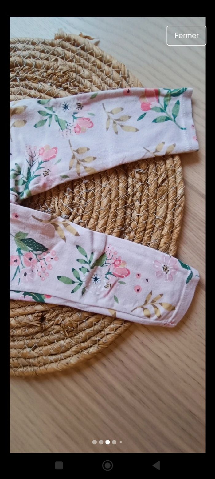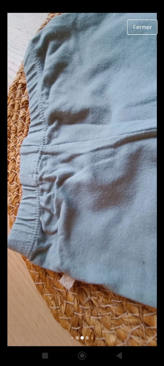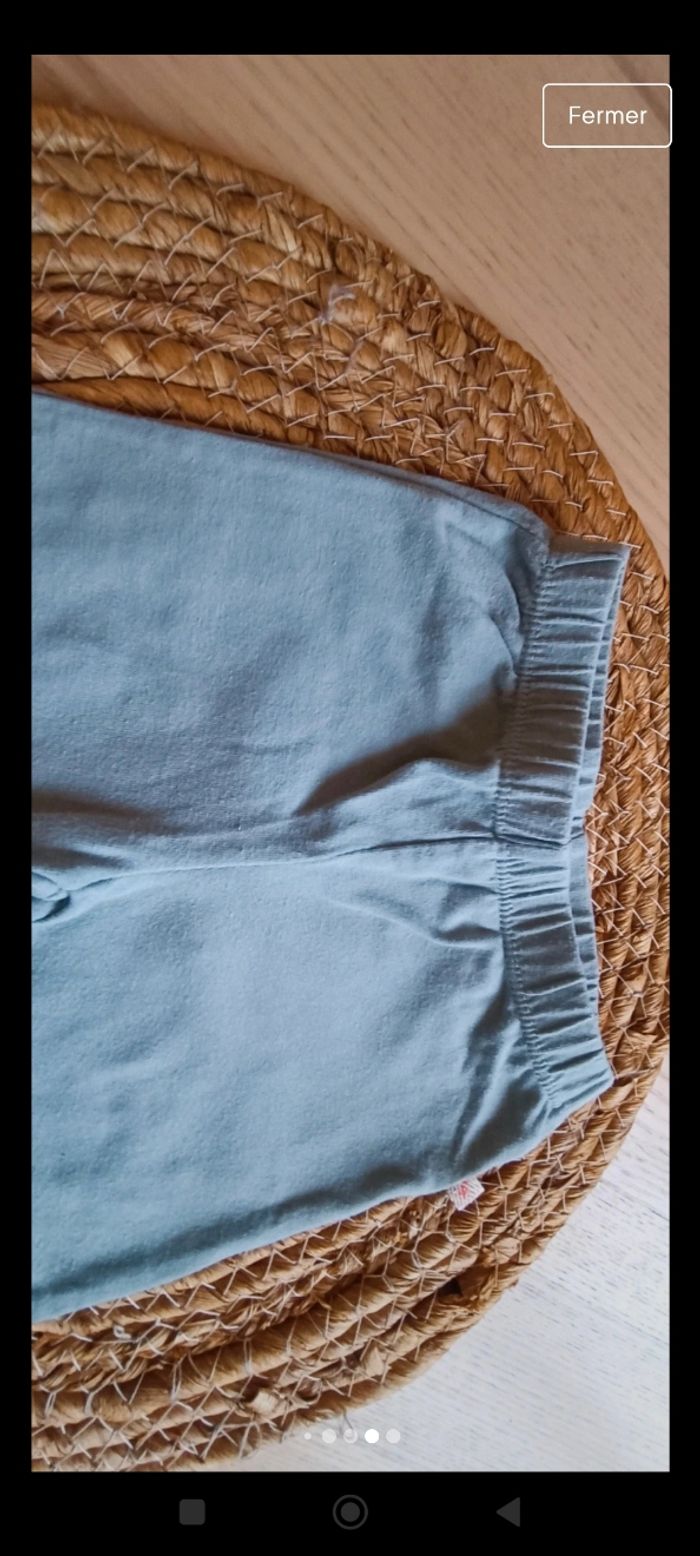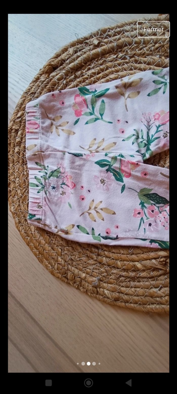 Leggings a fleur en bon état porté plusieurs fois, couleur un peu moins criarde et un legging vert d'eau porté quelques fois en bon état également. Les Leggings taille correctement. Taille 9 mois