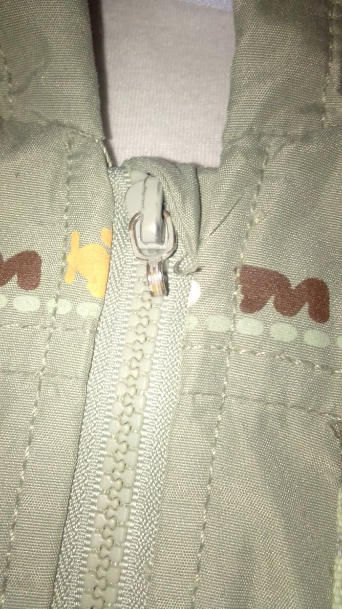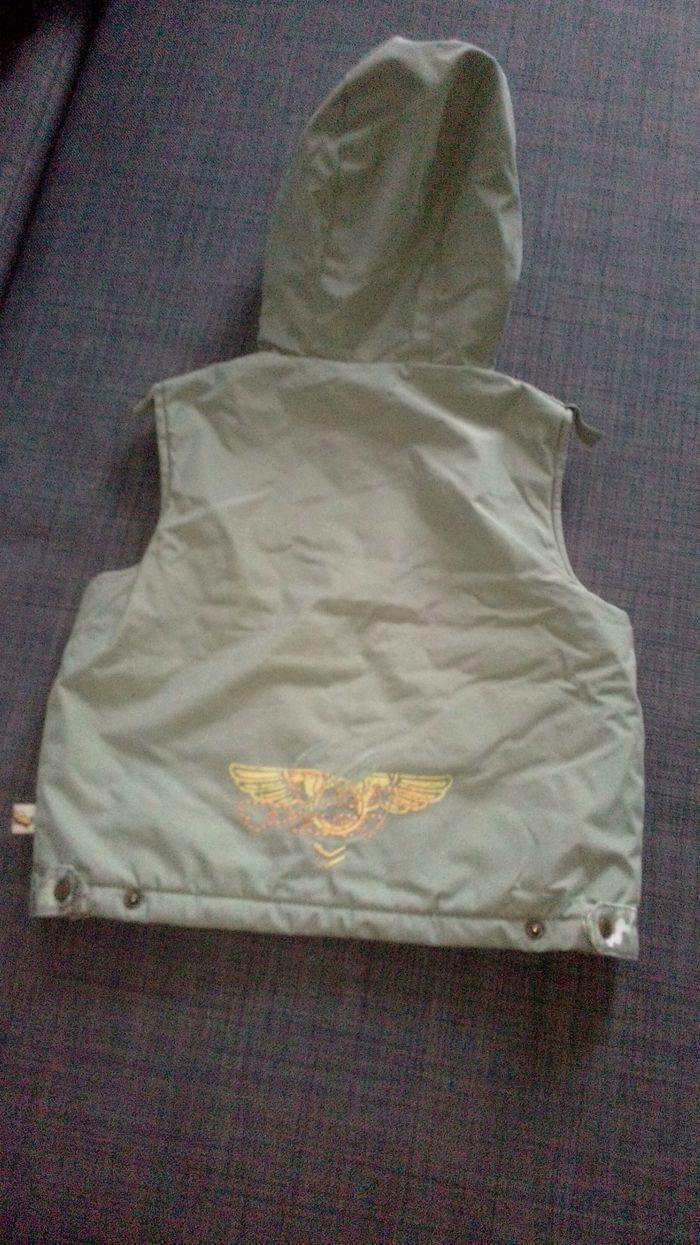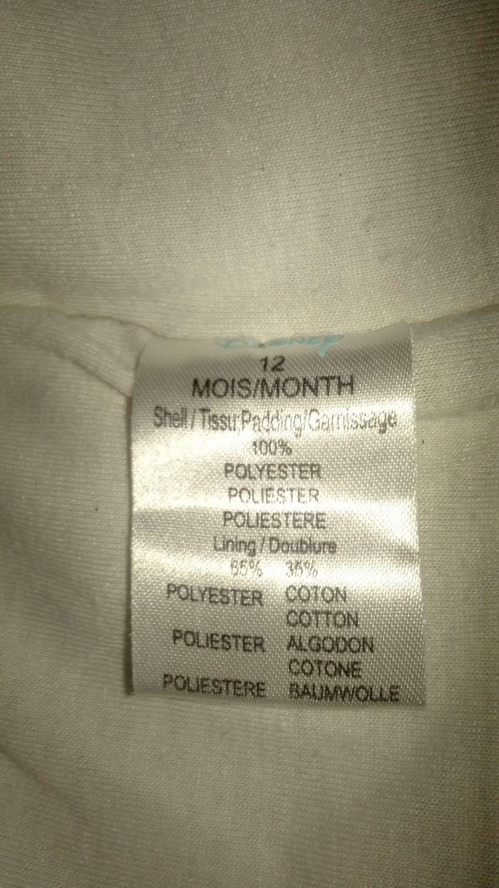 Veste polaire sans manches Il y a un petit soucis. La fermeture va nickel aucuns soucis de se côté mais le truc pour la ferme manque un bout. Sa ne gêne en rien pour ferme la veste. ( Voir photos ) Mis à par se petit soucis la il n'y a rien d'autres Taille 12 mois Marque=>> Disney