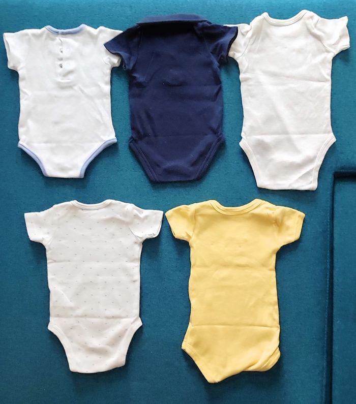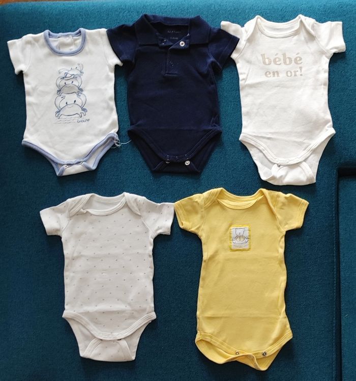 5 bodies manches courtes en coton. Sur le bleu foncé, la taille est notée 3 mois mais il taille en réalité comme un 1 mois (si comparé au autres bodies présents sur la photo). Très bon état. Pas de tâche.