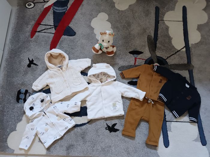 Veste et gilet de 3mois. 1 gilet fourré très chaud couleur écru, 1 manteau blanc winnie très epais, 2 vestes camel et bleu marine 1 veste panda légère