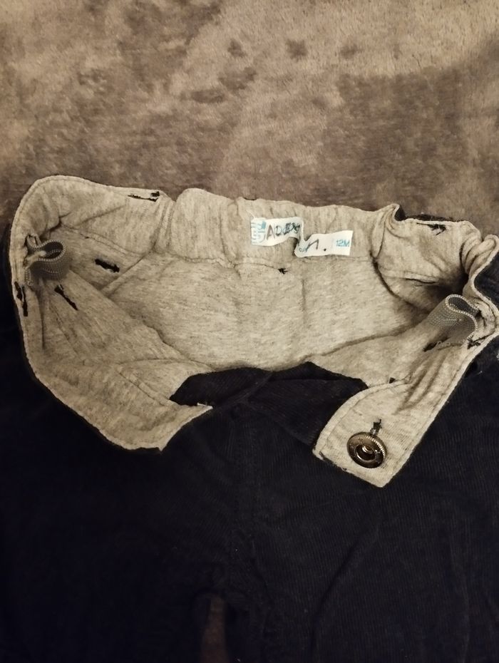 Pantalon velours doublé avec revers Semble noir sur les photos mais il est bleu marine Ceinture élastiquée + bouton pression et boutons de serrage à l'intérieur Taille 12 mois Très bon état, très peu porté 📍 Prénom de mon fils écrit sur l'étiquette, je peux coller une étiquette blanche pour vêtements par dessus..
