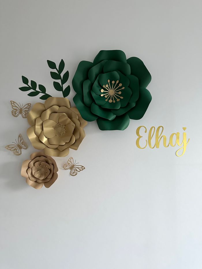 Composition florale en papier pour deco chambre bébé. Possibilité de le faire avec les couleurs de votre choix. La découpe du prénom est offerte