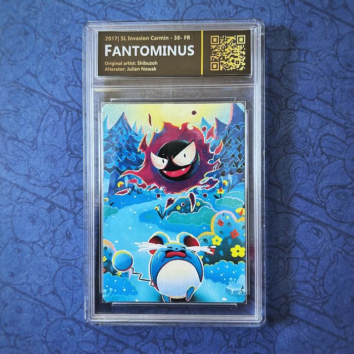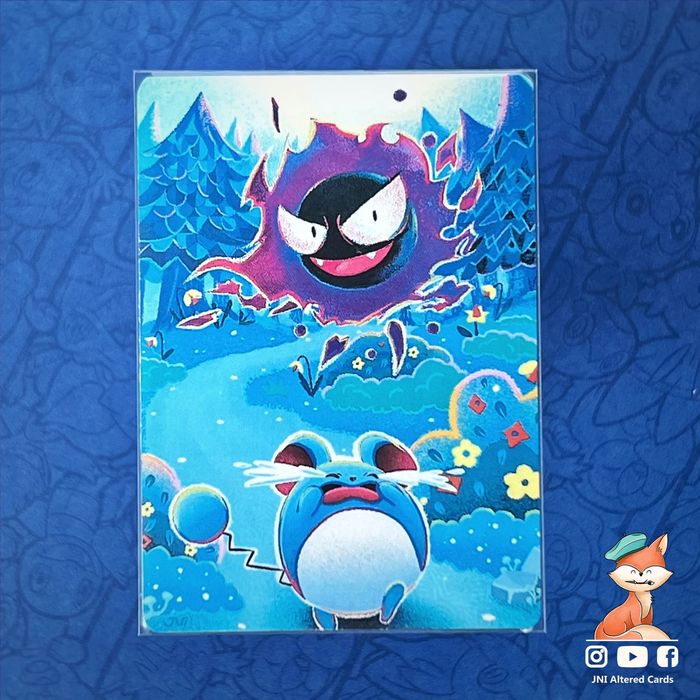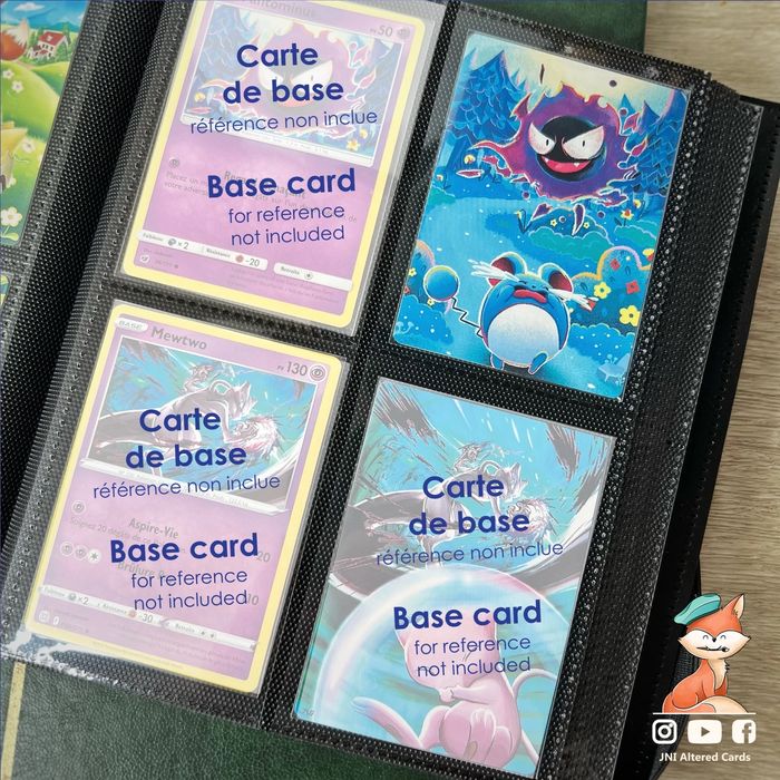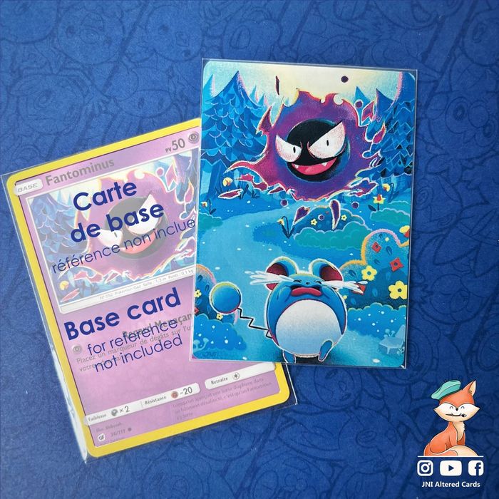 Impression d’une altération numérique réalisée à partir d’une carte Pokémon L’impression est réalisée sur du papier autocollant brillant. L’illustration est collée sur une carte Pokémon originale (généralement une énergie). Le tout est ajusté à la main pour avoir la meilleure finition possible. Le produit fait donc les mêmes dimensions qu’une carte Pokémon classique (63,5 mm X 88,9 mm) L’ensemble est placé et envoyé sous sleeve perfect fit. 🃏Information sur l’illustration de base🃏 Pokémon : Fantominus | gastly Année : 2017 Extension : Soleil et Lune Invasion Carmin Numéro de la carte : 36/111 Illustration : Shibuzoh ⭐️étiquette et boitier⭐️ L’étiquette regroupe toutes les infos de la carte de base. le qr code renvoie vers mon instagram: @jni_altered_cards le boitier n'est pas scellé pour que vous puissiez changer l'étiquette ou sortir la carte. ⚠️attention, il est important que vous sachiez que la société de gradation JNI n'existe pas, ce sont juste les initiales de mon activité (JN illustrations) j'ai juste voulu crée une jolie étiquette pour accompagner mes cartes. En effet, il n'existe aucune société permettant de grader des altérations. Tag: altération, personnalisé , personnalisation, custom , customisé, gastly, marill