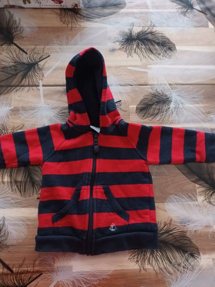 Bonjour je vend un sweat avec une fermeture couleur rouge et bleu marine taille 6 mois