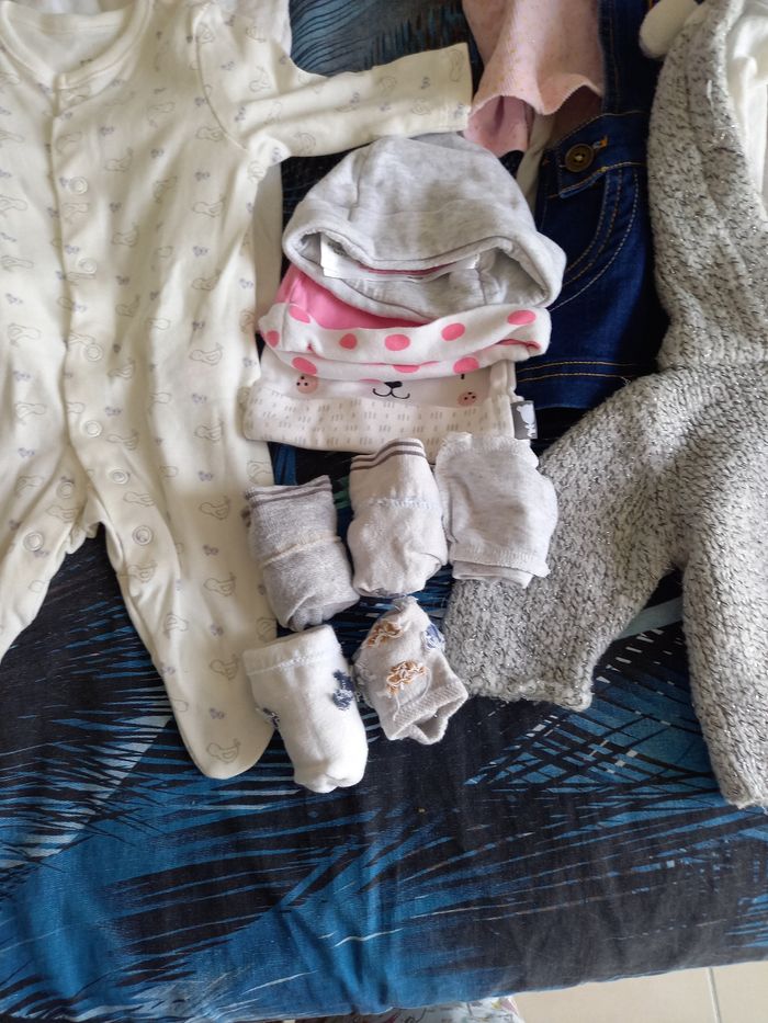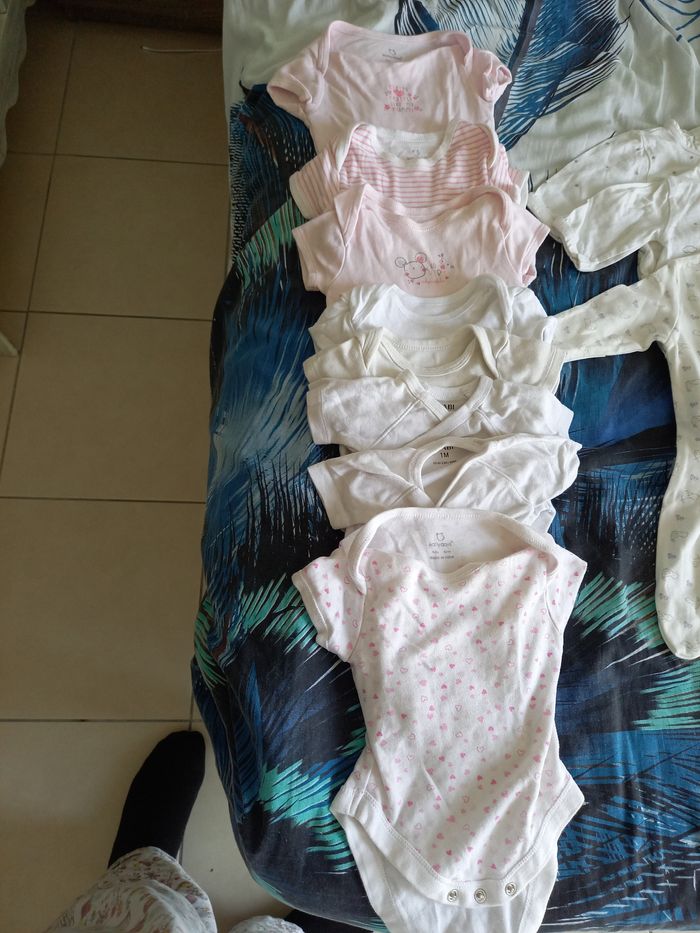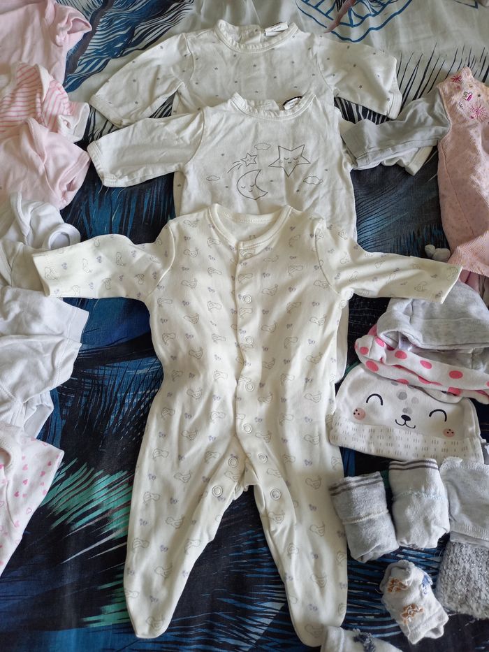 Vends lot de vêtements bébé fille à 1 mois de très bon état voir des articles neufs le temps pour 26 € tout type de marque. 8 body manche courte 3 pyjama léger 4 chaussettes 3 bonnet 1 petit gant 1 gilet 1 robe en Jean 1 tenue