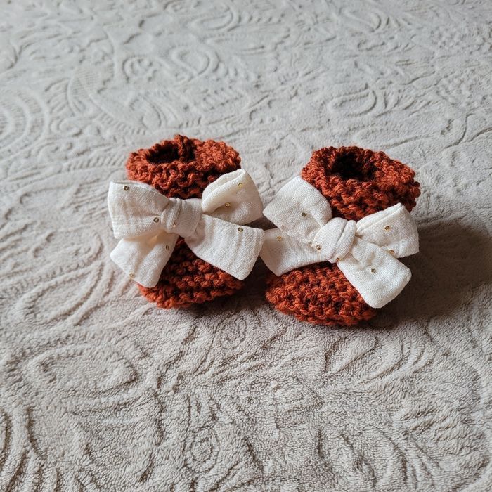 Chaussons tricot taille 1/3mois terracotta et nœud double gaze écru à pois dorés. Neufs