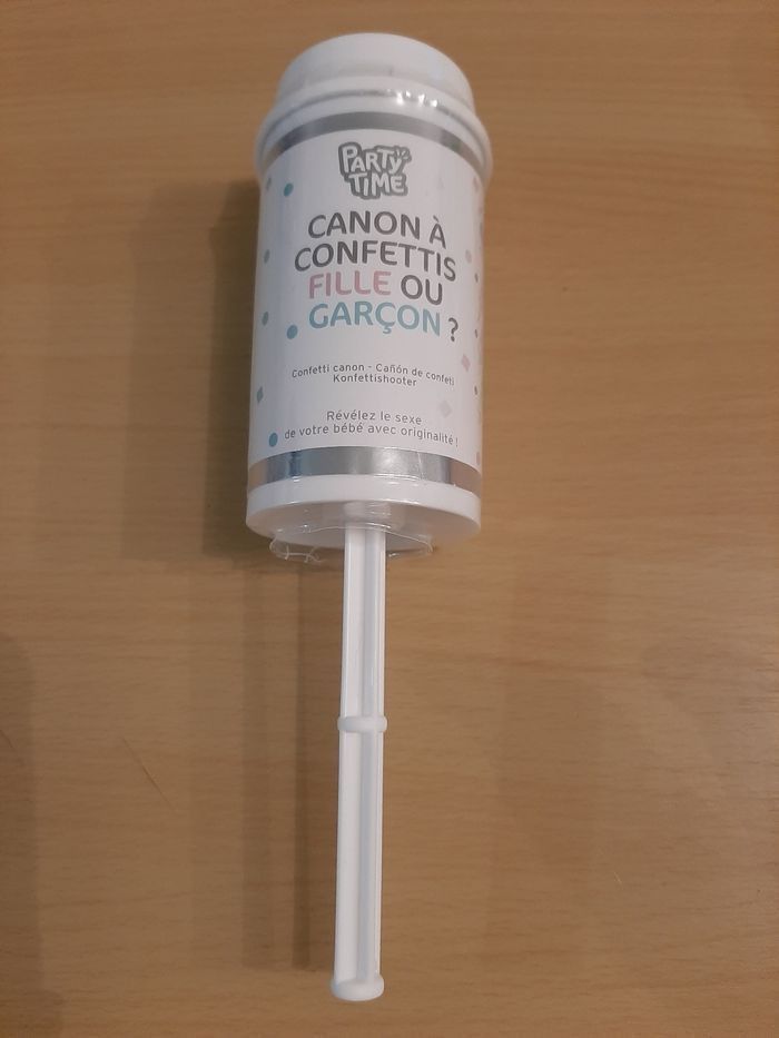 Canon à confettis pour annoncer la future naissance d'un petit garçon.