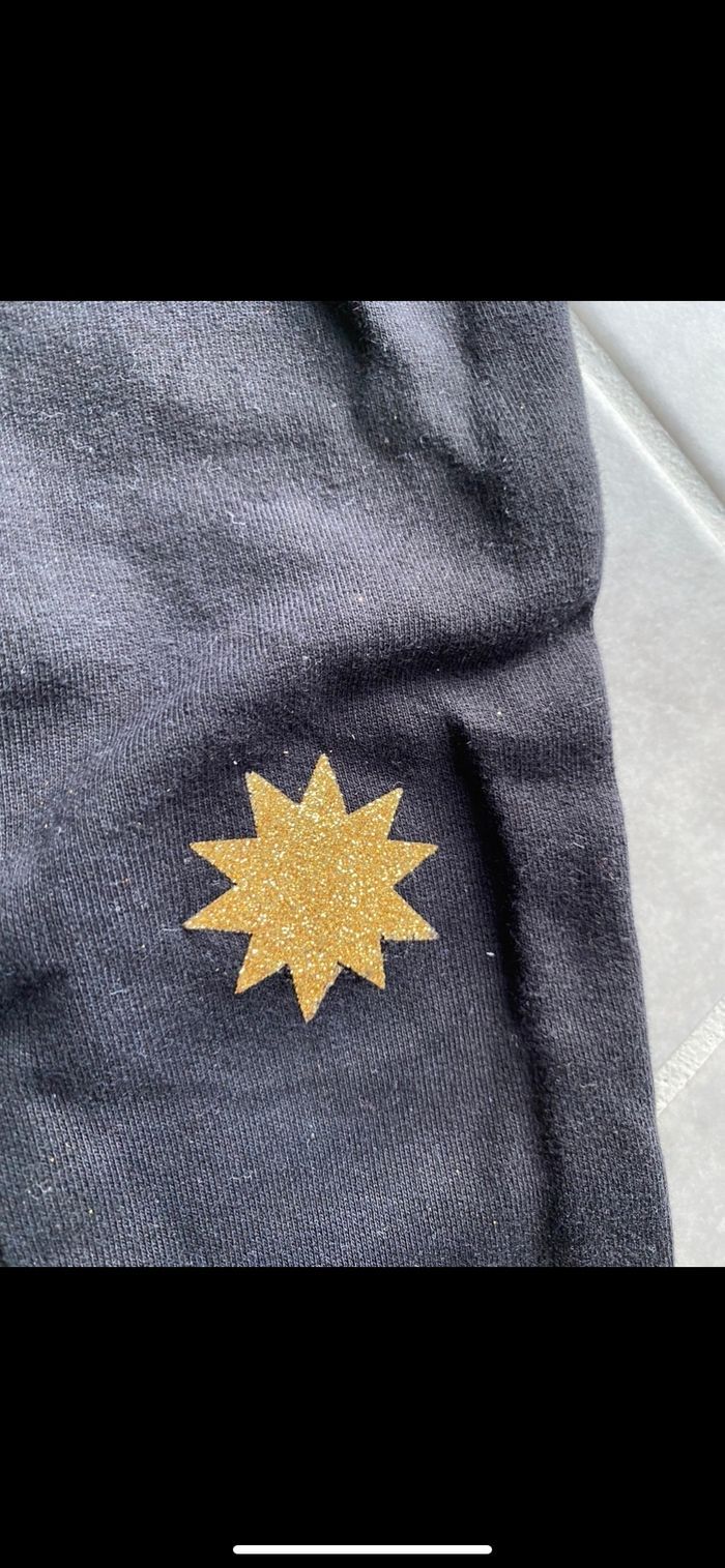 Porté, il y avait un petit trou donc une couturière a mis un écusson ce qui le rend unique. Couleur bien noir. Épais, très bonne qualité. N’hésitez pas à me suivre car encore beaucoup de vêtements fille, des chaussures en cuir, des chaussons… (du 1 mois au 8 ans), des vêtements garçon (du 1 au 12 mois pour le moment ). Maison non-fumeurs et sans animaux même si je les adore. Il n'y aura pas de poils ou d'odeur désagréable. Vous recherchez quelques choses, demandez moi. Je réponds très rapidement. Bon shopping 😊.