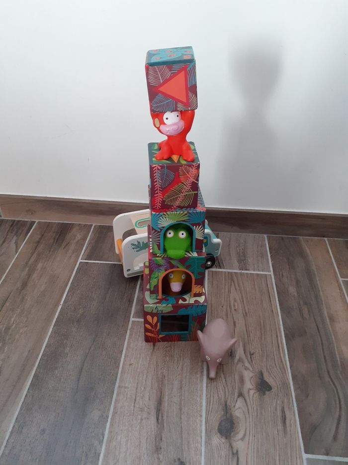 Jeux d'emplilement 5 cubes et 4 animaux maxi Topanijungle (il manque le 5ème animal le tigre ) De 1 an et demi à 3 ans environ En bon état.