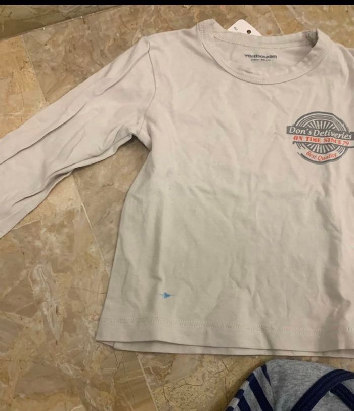 Les 2 t shirts Le beige 2 ans a une tache donc je le donne avec L’autre en très bon état marque absorba
