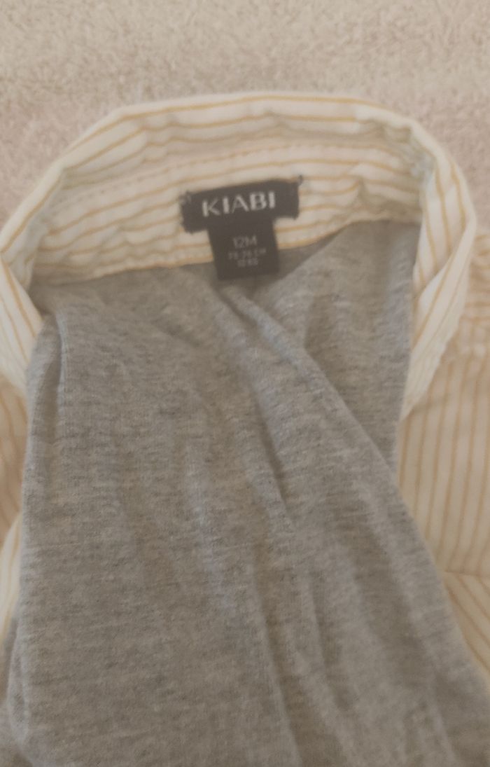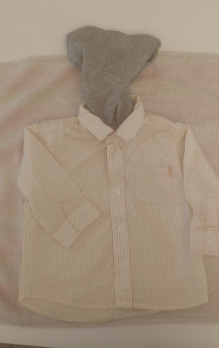 Chemise avec capuche insérée (oui oui, vous avez bien lu!) Elle est de couleur jaune avec de fines rayures blanches (ou l inverse) La capuche est grise Très peu mise Petite poche au niveau de la poitrine Taille notée : 12mois Marque : Kiabi