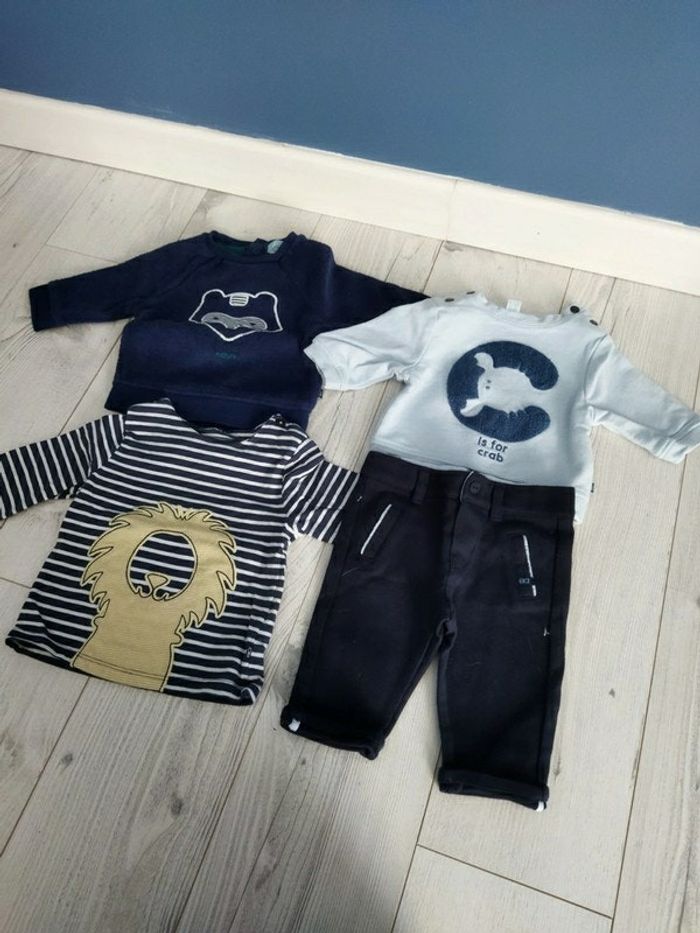 Lot Okaïdi taille 3 mois composé d'un pantalon souple, 1 sweat, 1 pull et 1 tee shirt. Neuf, juste lavé, avec le confinement bébé n'a mis que des pyjamas !
