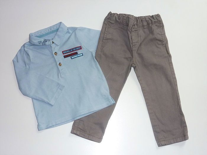 Ensemble de marque VERT BAUDET en état excellent, comme neuf, composé d'un pantalon gris taille ajustable et du polo bleu pastel assorti.