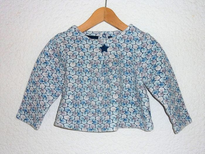 Blouse en molleton, de marque OBAIBI, en excellent état. Blanc, imprimé bleu et gris.