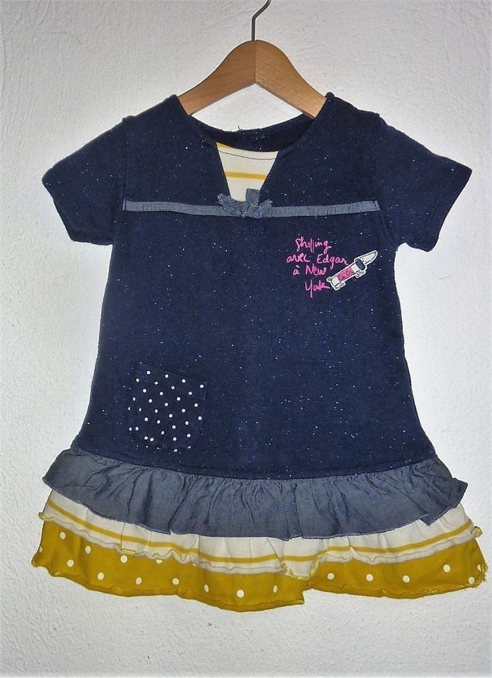 Tunique de marque COMPAGNIE DES PETITS en excellent état, bleue irisée et jaune, à volants, ornée de rayures, de pois et d'un motif irisé. Fermeture par pressions dans le dos.