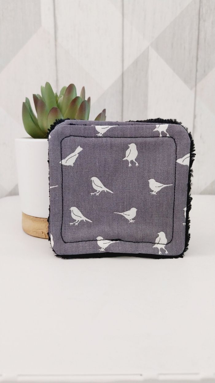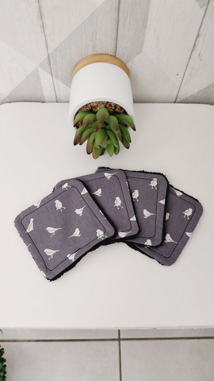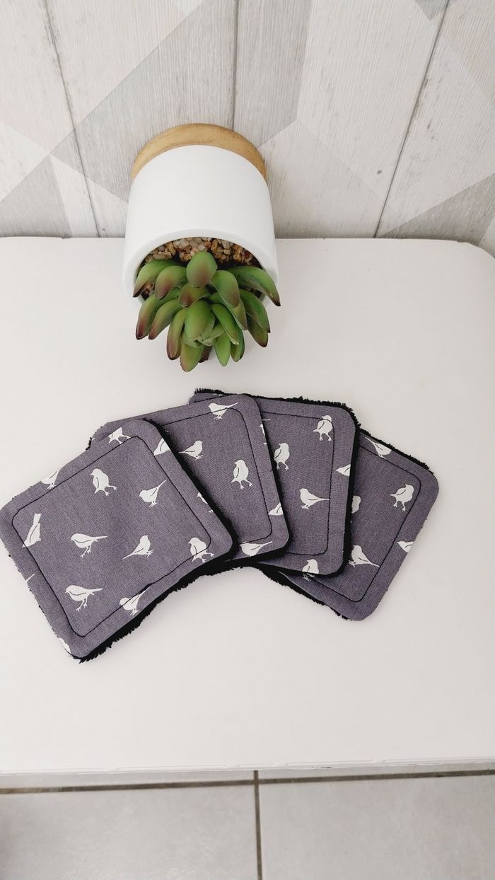 Lot lingettes démaquillantes.💖💖💖 Entièrement réalisées par mes soins dans mon atelier de couture.🤚🤚 Matières Eoko - Tex sans substance nocive pour la santé. Tissu NEUF 💗 Lot de 4 lingettes. Coloris : gris et noir. Matières : éponge de bambou+ coton. Motifs : oiseaux 🦜 Dimensions : 9 x 9 cm . Coins arrondis. Lavables, réutilisables , écologiques . Lavable à 30 - 40 ° C. Séchage à l'air libre. Repassage doux. Voir mon dressing , d'autres créations . Envoi soigné 🌺.