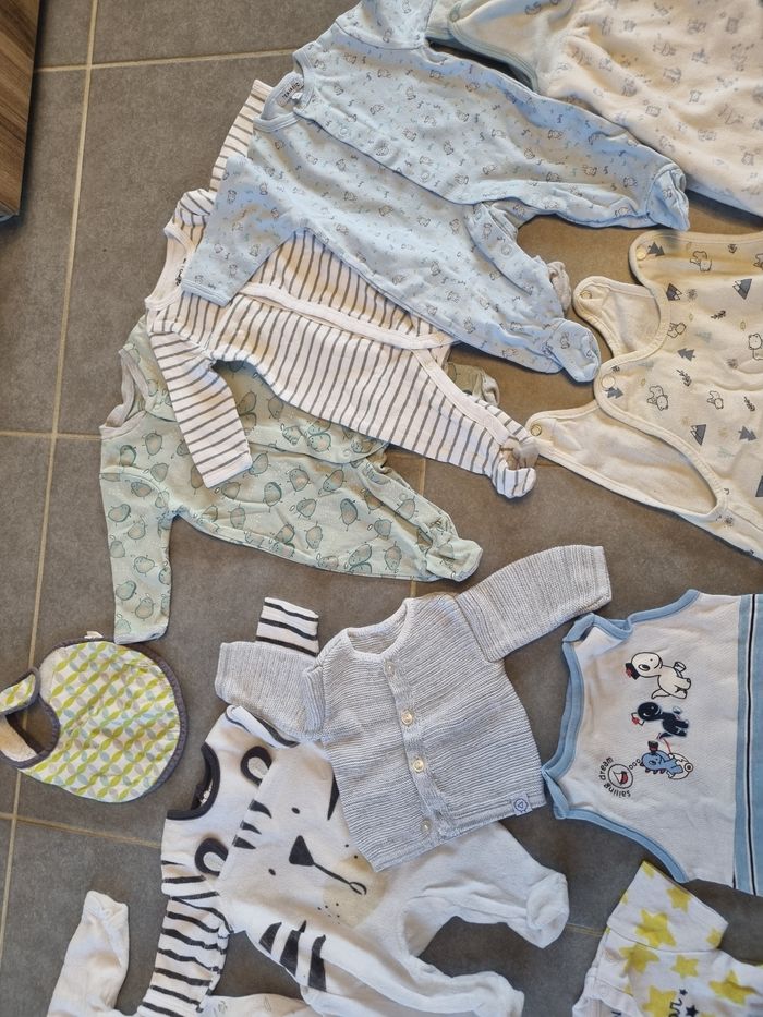 Vends divers habits et accessoires de tailles 1 mois. Tout ce qui faut pour la naissance : -Petit Chaussons -chaussettes -bonnet pour la naissance -gants de naissance (pour éviter les griffures) -4 gigoteuses -6 bodies -8 pyjamas -1 tenu tee-shirt +shirt -1 pyjamas (le haut +le bas) -1 veste -1 bavoir De marques: orchestra, gemo,kiabi, Primark,... Le tout en Excellent état car mon fils était super grand à la naissance donc porté peu de fois. Le tout vendu 30 euros, ce qui est un excellent prix.