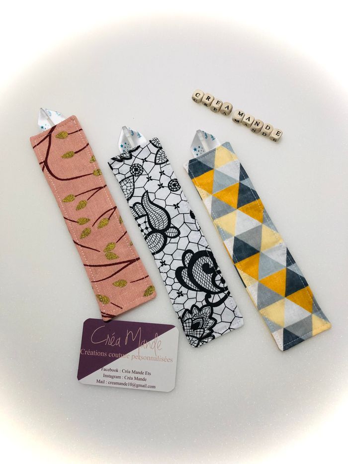 Marque page Possibilité de les personnalisé avec un prénom , un surnom ou autre Nombreux choix de tissus 9€ l’un 15€ les 2 21 euros les 3