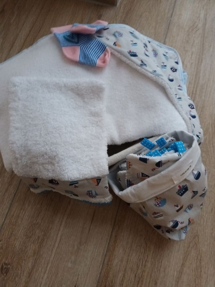 Ensemble bébé en tissu coton éponge se compose une sortie de bain, 1 grand de toilette et une panière avec lingettes et en cadeau 1 petite paire de chaussettes