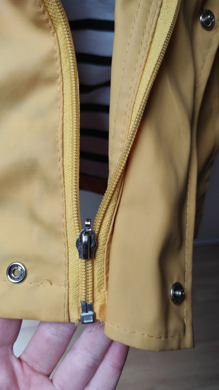 Manteau ciré jaune, intérieur marinière 12 mois. La languette de la fermeture est cassée mais n'empêche pas de fermer (voir photo)