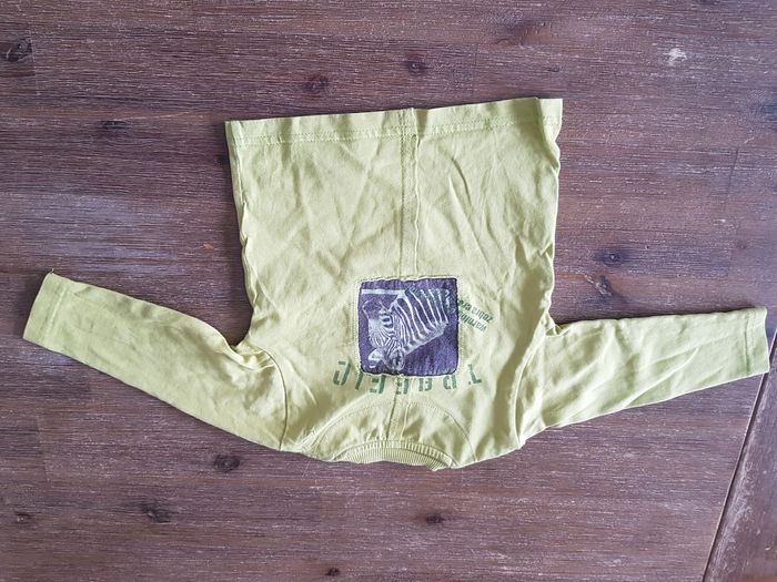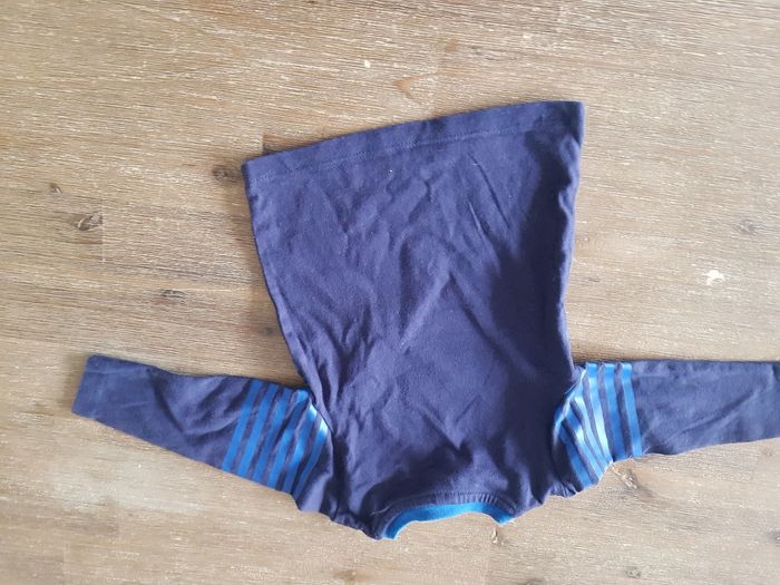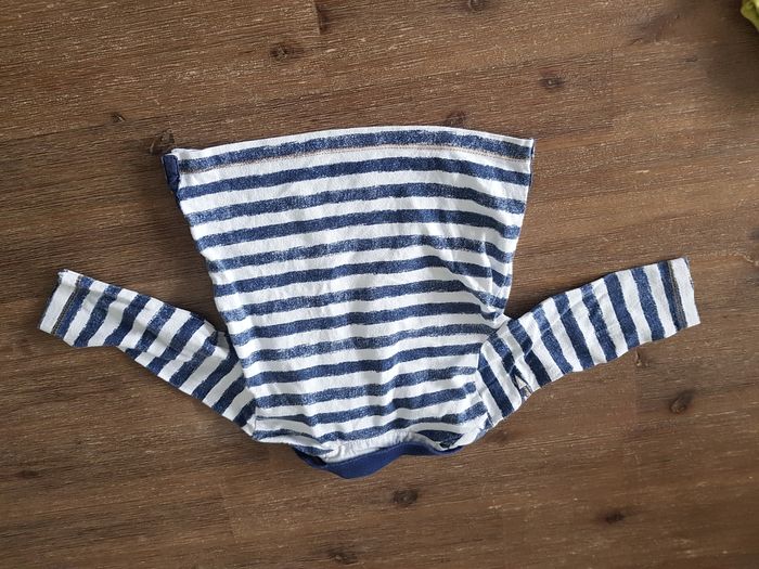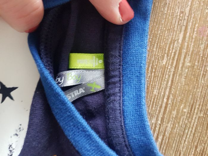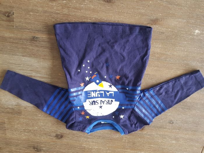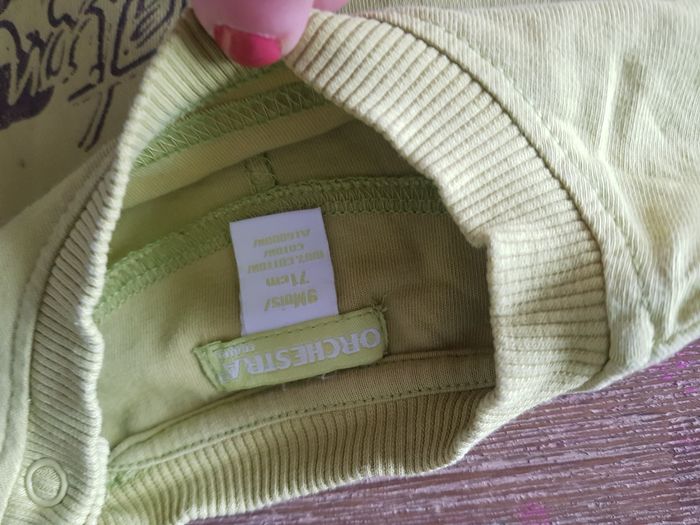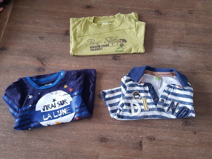 Lot de 3 tee shirts a manches longues Taille 9 mois,71 cm Marque orchestra L un est a rayures bleues et blanches avec col chemise, un vert anis, un bleu foncé