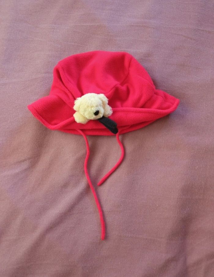 Vends bonnet rouge avec tête d'ourson en très bon état (taille unique)
