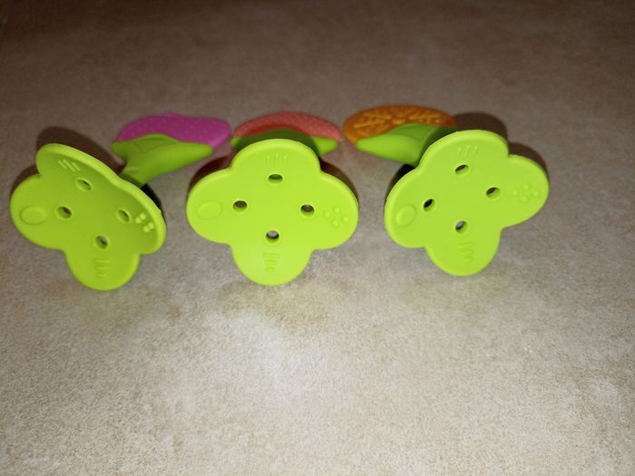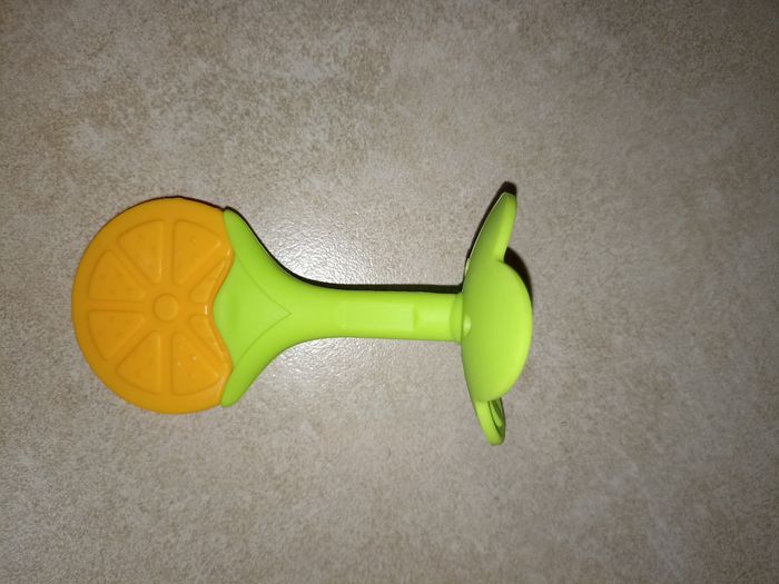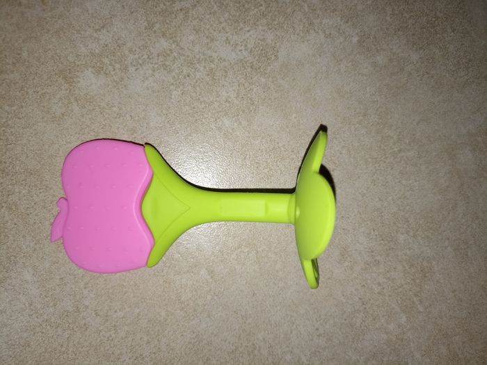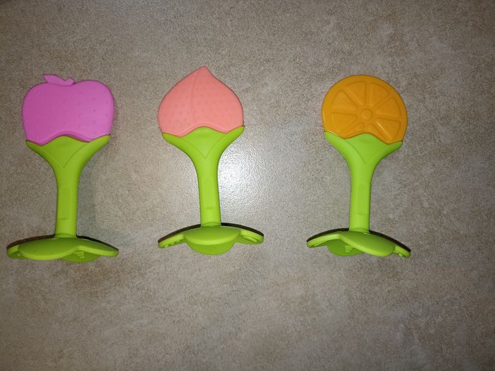 Jouets de dentition neufs, jamais servis. Ils sont en silicone alimentaire souple, se lavent à l'eau, au savon et peuvent être placés au frigo. Ils sont sans BPA. Pomme 🍎, pêche 🍑 et orange 🍊. À l'unité = 4 € Les deux = 7 € Les trois = 9 € Chacun d'entre eux a des petits reliefs pour soulager les gencives de bébé pendant ses poussées dentaires. Les deux extrémités soulagent bébé, ils s'attrapent facilement avec leurs petites mains maladroite car la tige est fine mais pas trop, souple mais pas trop et à la longueur idéale. Je les ai choisi parce qu'ils sont sécurisés aux deux extrémités, l'enfant ne peut pas l'enfoncer dans sa bouche contrairement à beaucoup d'autres jouets de ce type.. Le mien a la fraise et le raisin, il ne les quitte plus !!! D'autres jouets de dentition sont disponibles dans mon dressing 😉