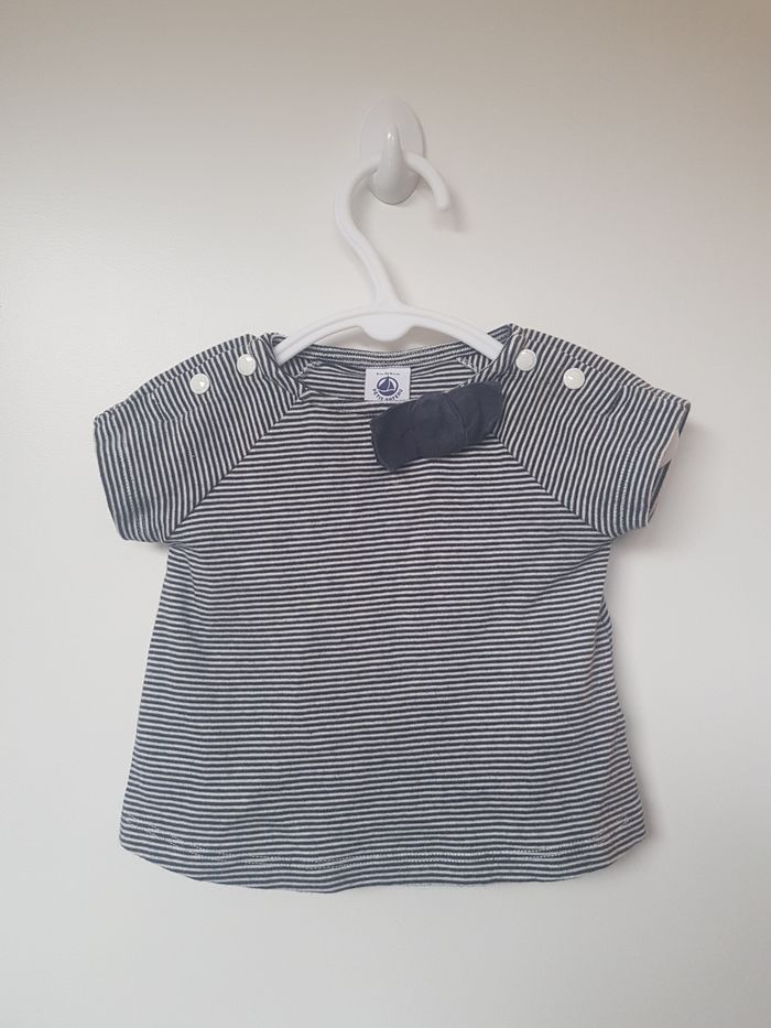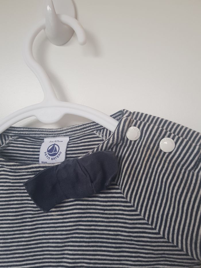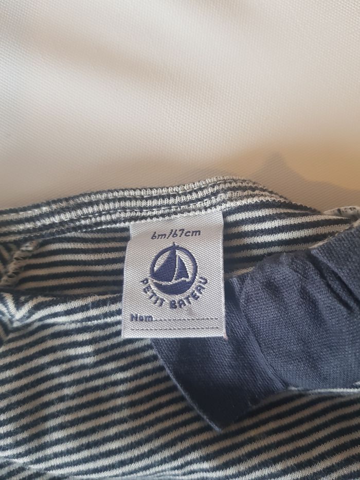 Tee-shirt marinière à manches courtes Marque : PETIT BATEAU Couleurs : bleu et blanc Taille : 6 mois - 67 cm État : très bon état 100% coton Retrait sur place ou envoi.