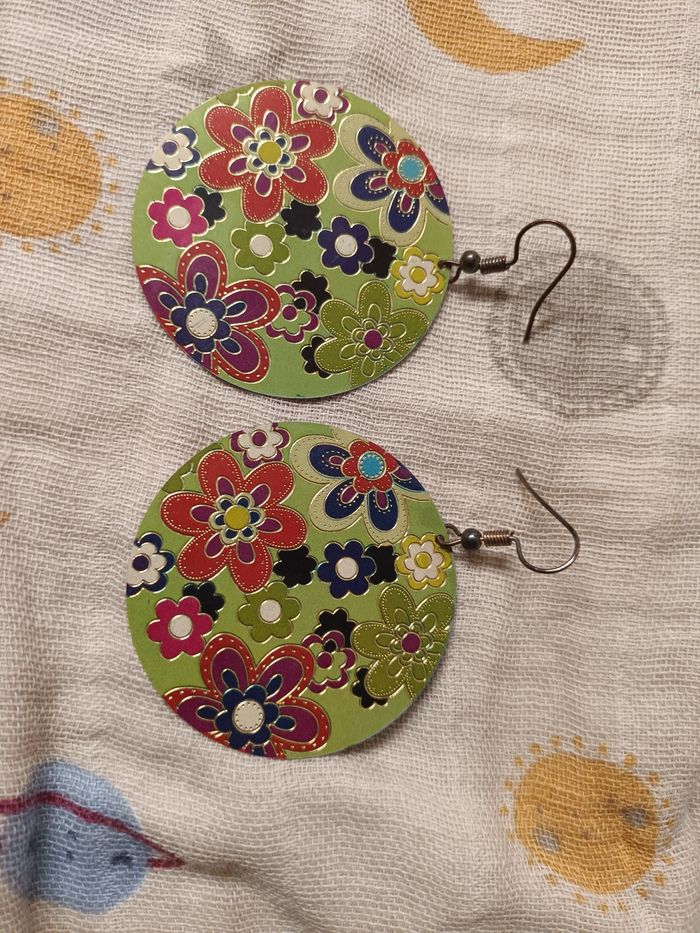 Boucle d'oreilles Verte avec des fleurs et doré de l'autre côté Déjà porté quelques fois
