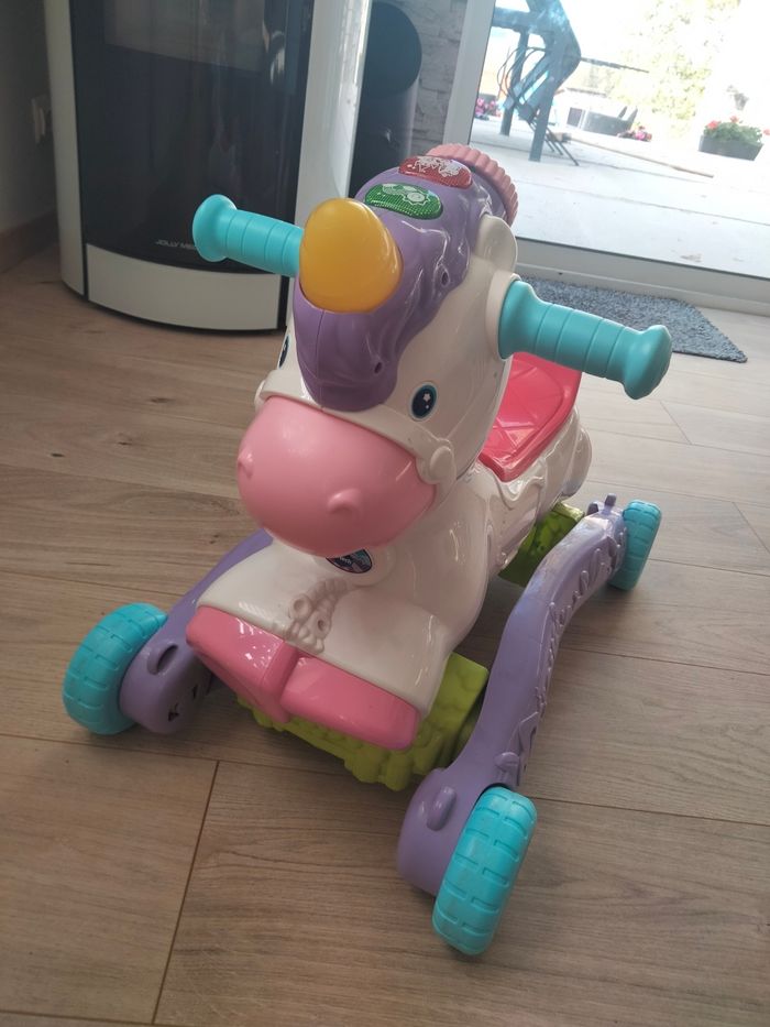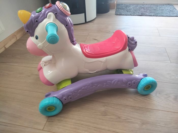 Vends licorne a bascule et a pousser Avec sons et lumières Quelques traces de frottement Fonctionne très bien