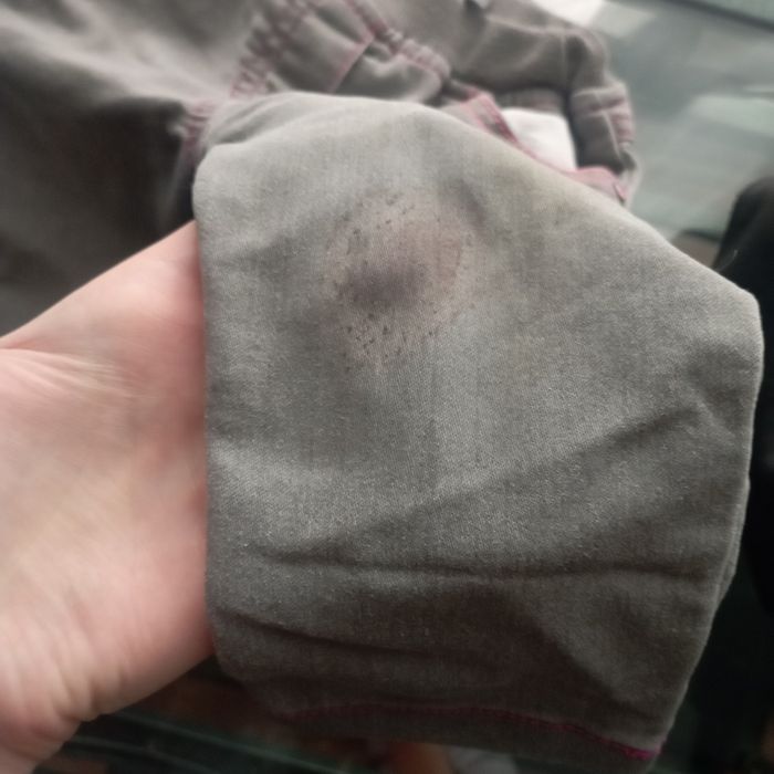 Pantalon jean gris élastique aux hanches petite tâche sur le pantalon Sinon en bon état pas d'autre signe particulier Photo prise pantalon mouillé sort de machine ( Je n'applique pas de produit détachant peut-être que sa partira un peu avec) 9 mois Il taille bien jusqu'à 12 mois ok !