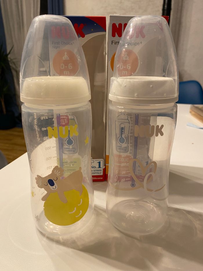 2 biberons Nuk dont un phosphorescent. Vendu sans les tétines. Très bon état