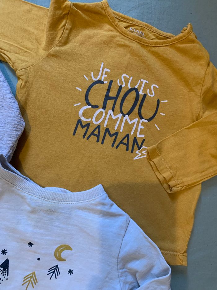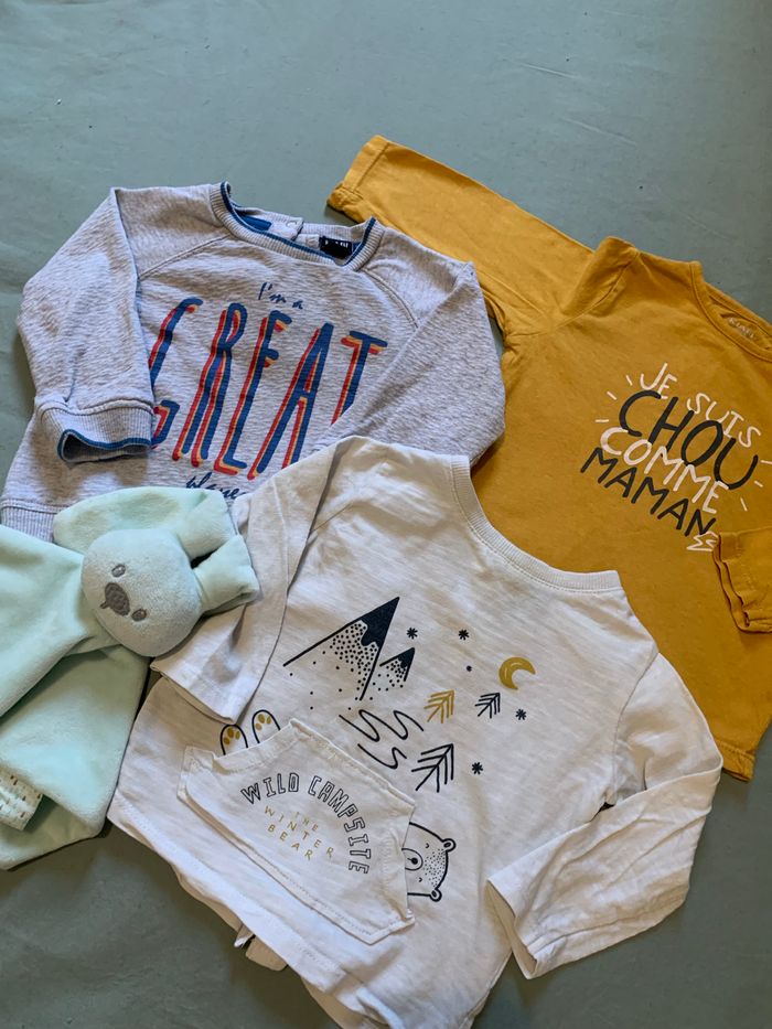 Lot bébé garcon comprenant un sweat et deux hauts. Très bon état Différentes marques Taille : 9 mois