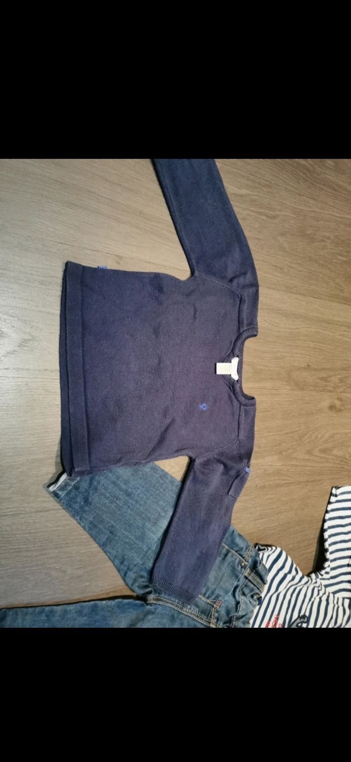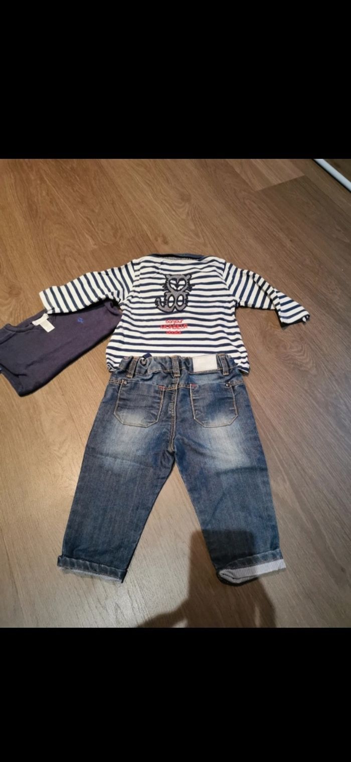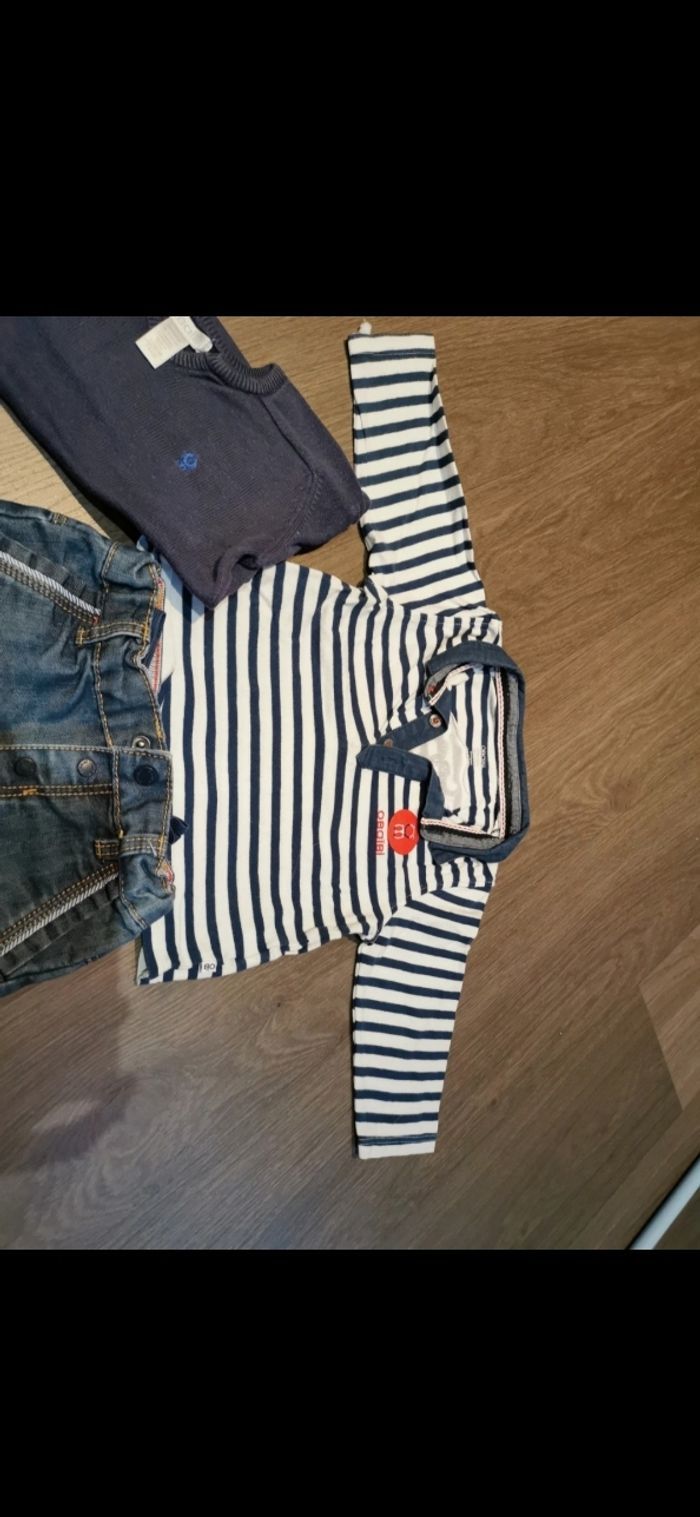 Ensemble avec pantalon, pull et t-shirt manches longues de la marque Obaïbi en 12 mois. Très bon état.