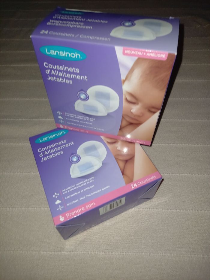 Je vends 2 boîtes neuves de coussinets d'allaitement de la marque Lansinoh. Il y a donc au total 48 coussinets.