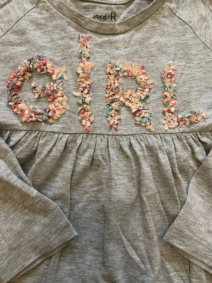 Je vends ce t-shirt gris chiné avec imprimé à fleurs GIRL en relief 52% polyester 48% coton