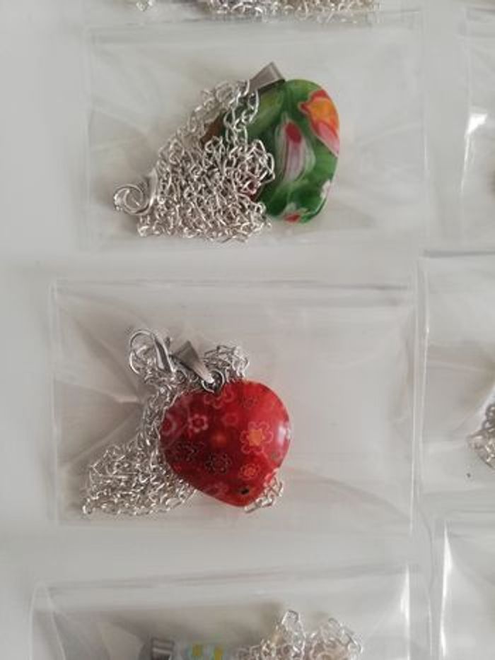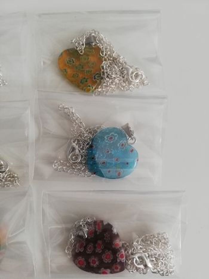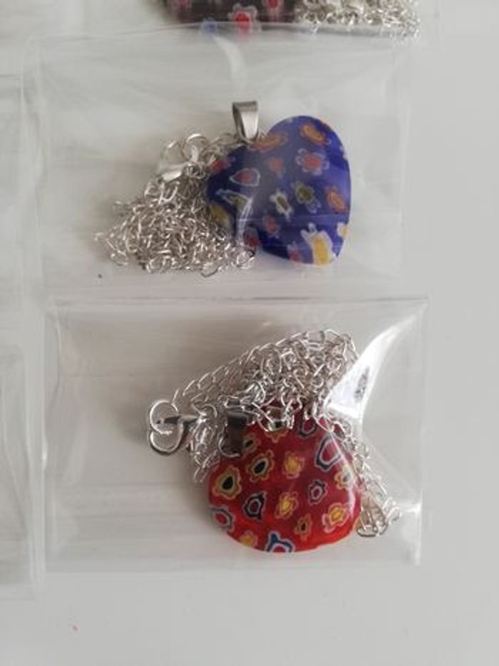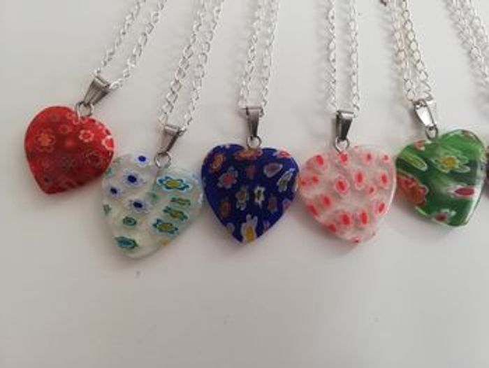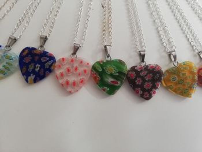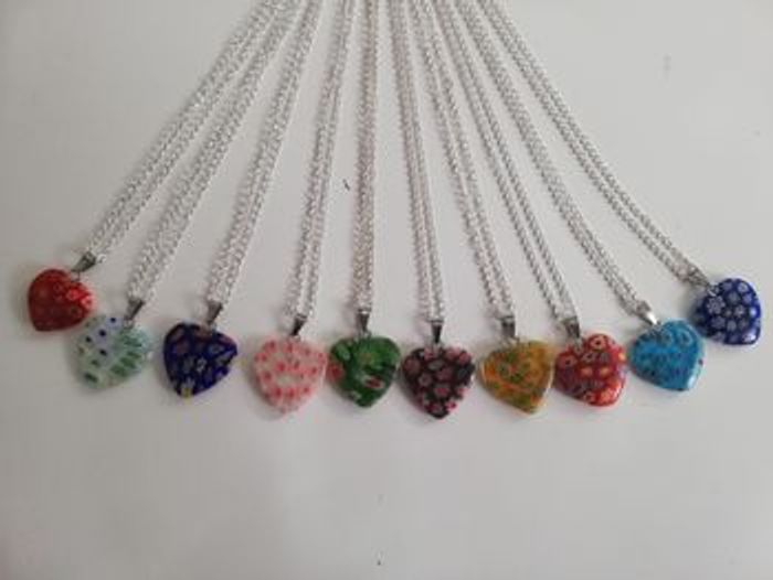 Lot de 10 colliers cœur en verre millfleuri et chaîne en métal argenté sans Nikel. St Valentin cœur love. 20 euros le lot.