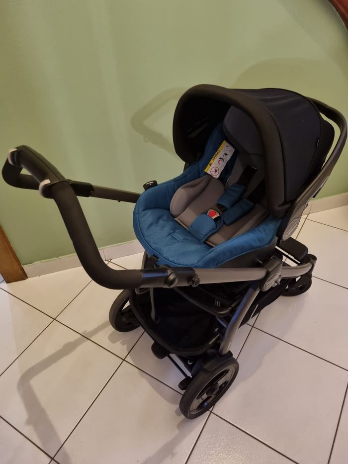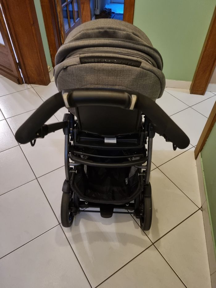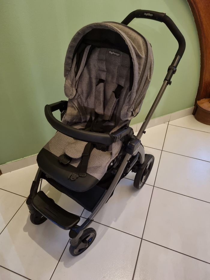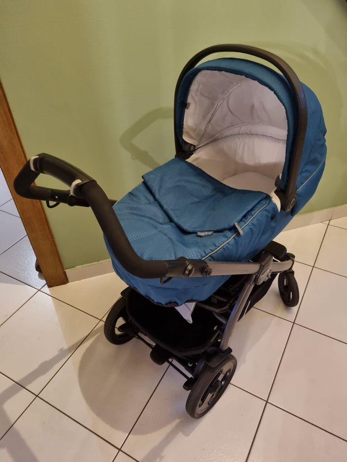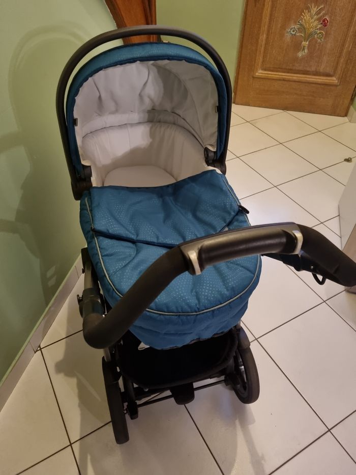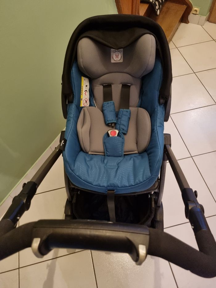 Poussette trio Peg perego Nacelle Cosy + base ( non isofix) Siege + sac à langer + protection pluie Tout est en très bon état pour les équipements. il y a juste quelques griffes sur le châssis de poussette Nous la vendons car nous cherchons une poussette double.