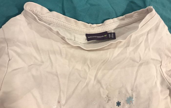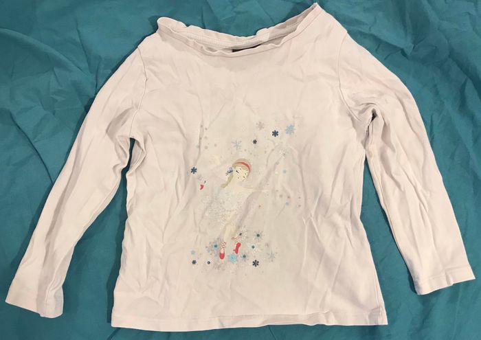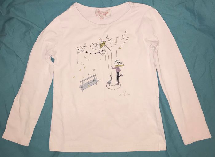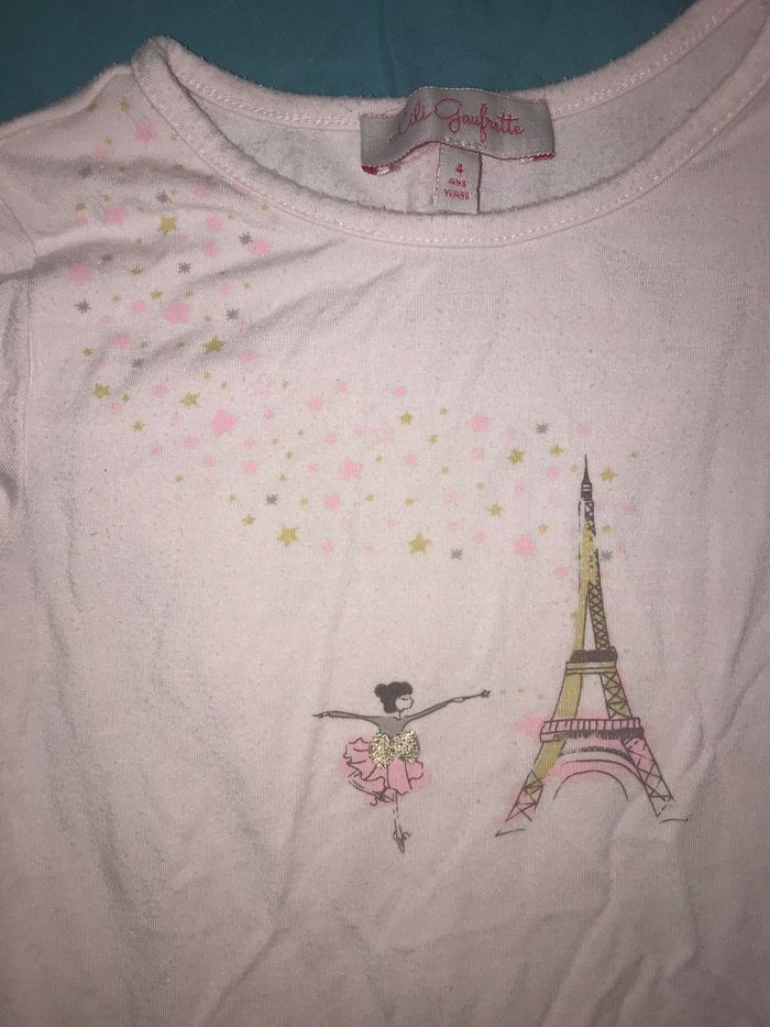 Hauts en bon état voir très bon Concernant le haut avec la petite fille cygne ( sergent major ) : haut porté 2-3fois, quelques paillettes effacées , motif un peu craquelé sur aile du haut Concernant celui avec petite fille danseuse , tour eiffel : matière coton douce, porté quelques fois, couleurs, motifs toujours bon état. Seul point négatif : bouloche Concernant le dernier haut : motif un peu effacé au niveau de la fille et Lili Gaufrette, quelques paillettes effacées et manque 3 strass niveau guirlande Autres photos ou renseignements possible si besoin