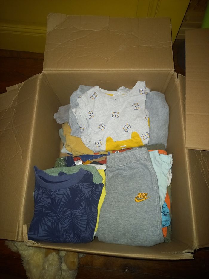 Vend carton de vêtements garçon du 1,3,6,12,18mois Différentes marques Petit carton 15 euros Moyen carton 40 euros Gros carton 60