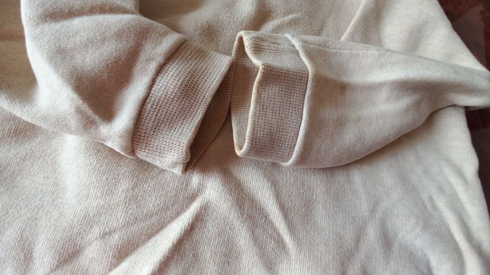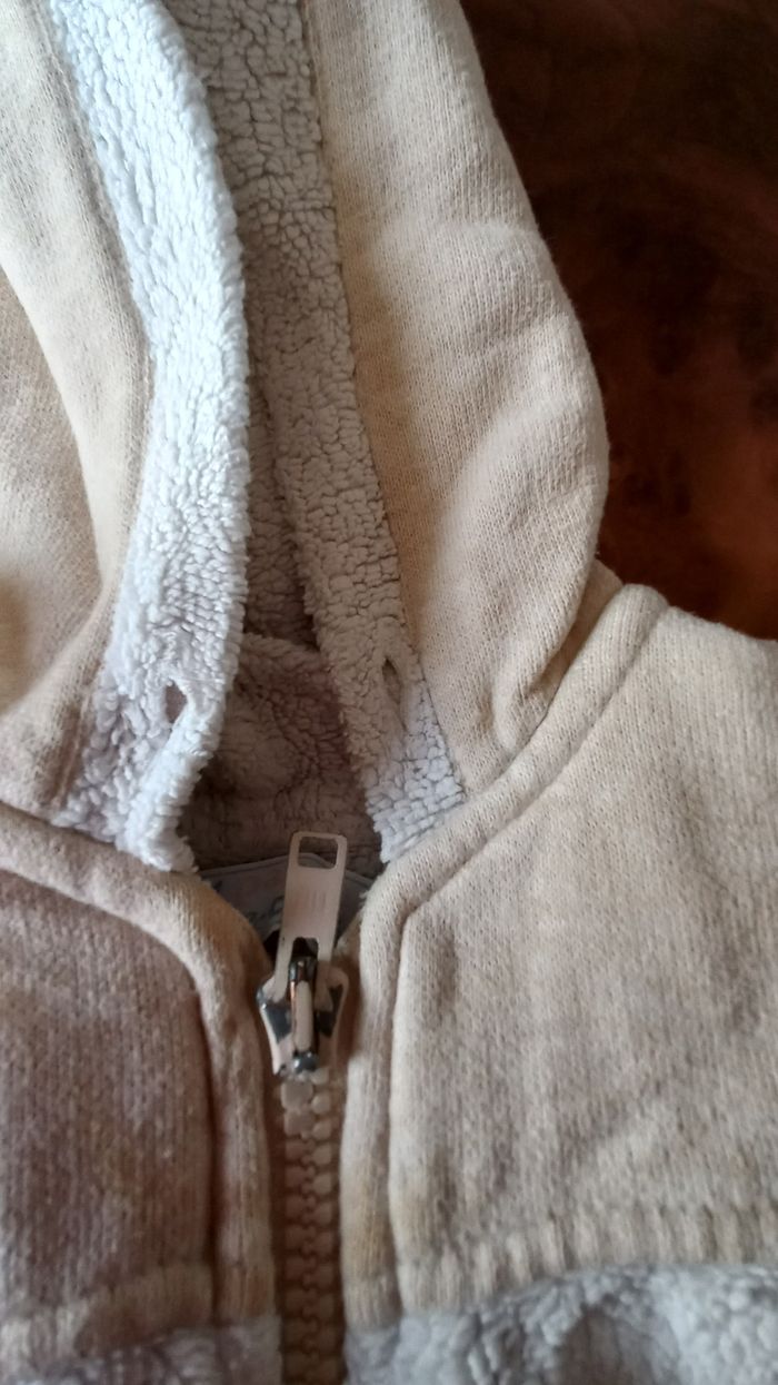 Gilet 18 mois couleur crème. 100 % coton ,État correct. Traces d'usure générale Petit trou au niveau de la manche . Quelques tâches jaunes.